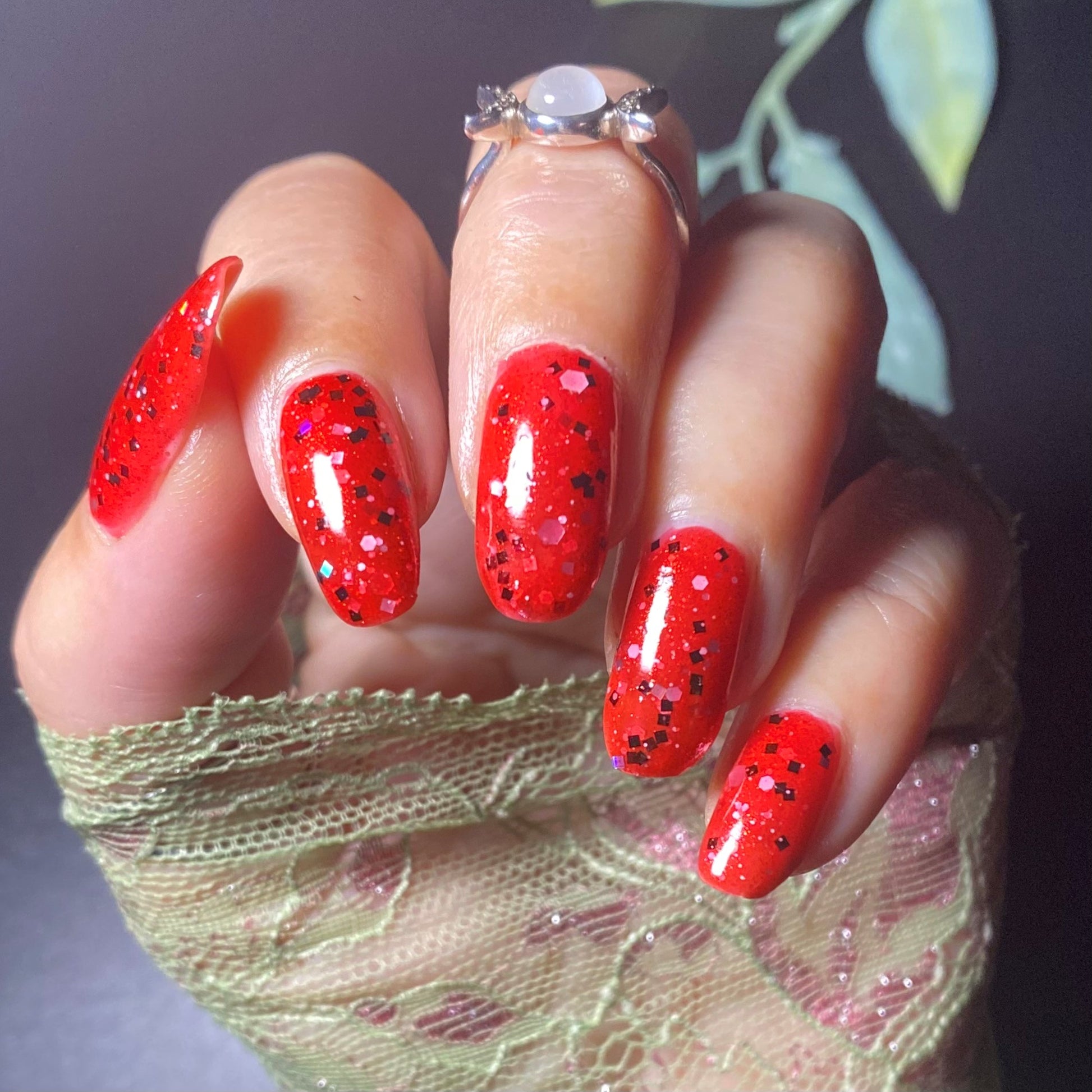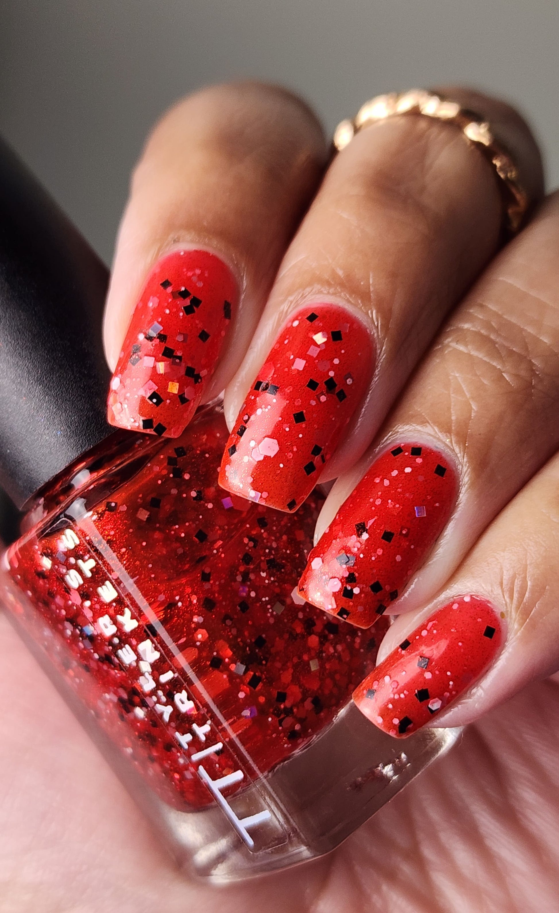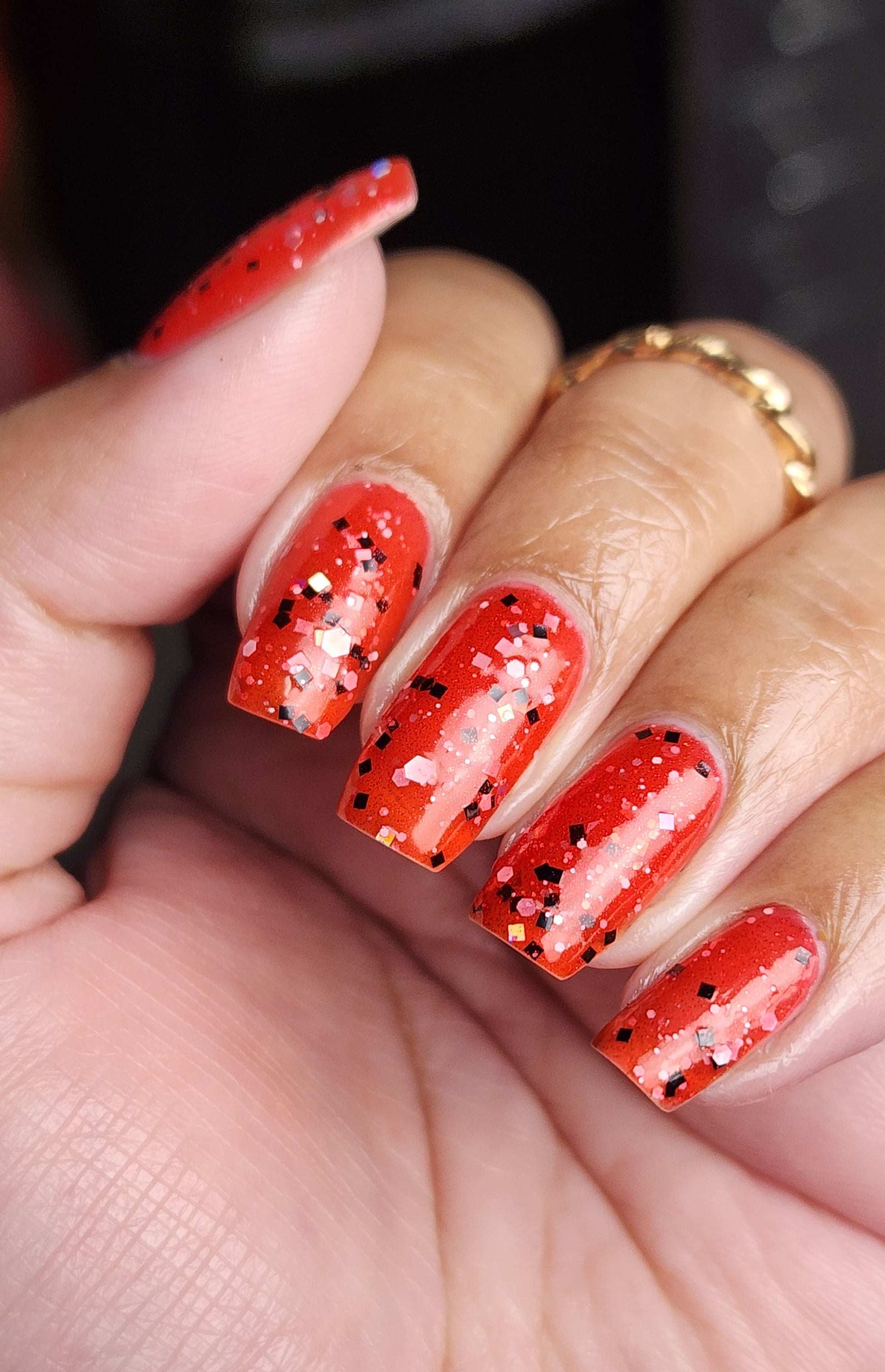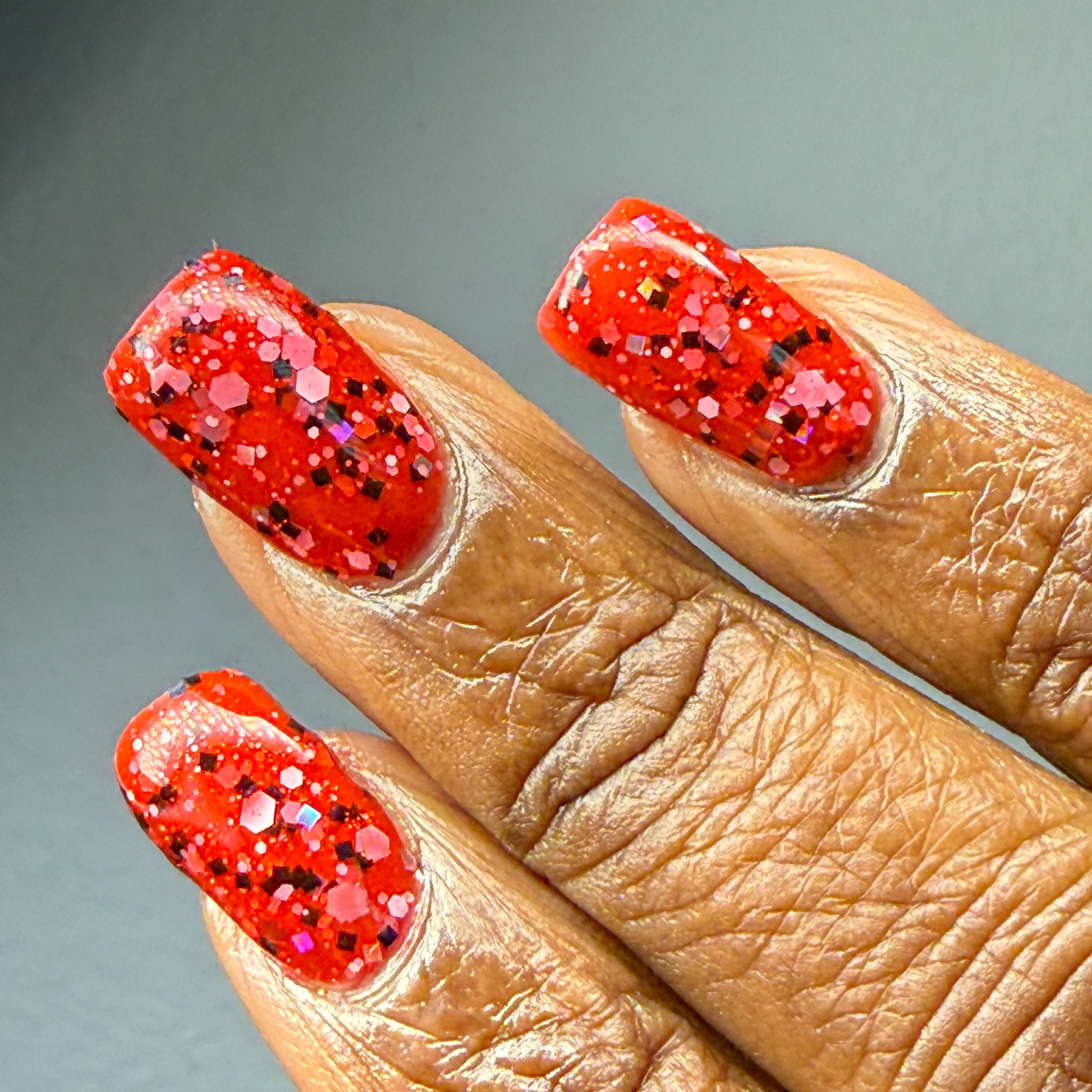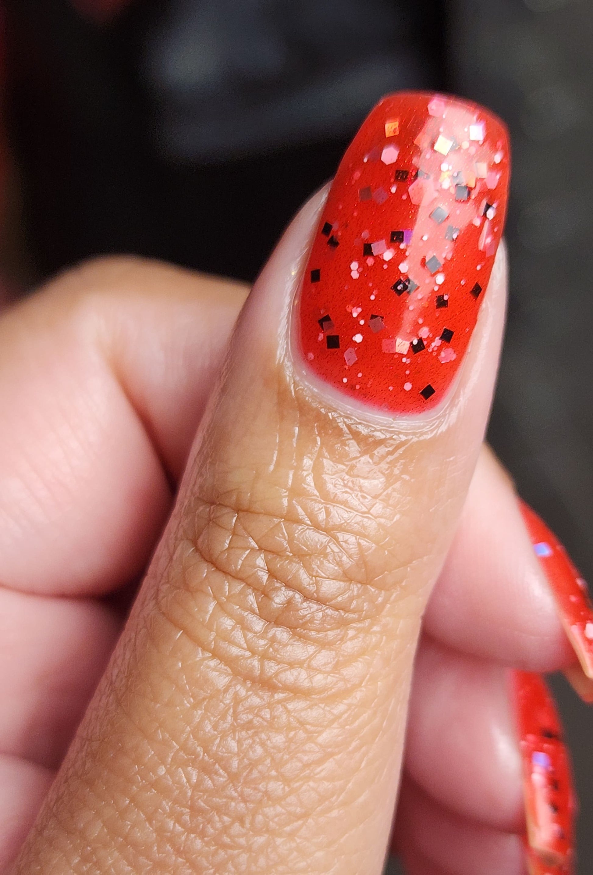 Inspired by the View Master! A red jelly base with red/orange/copper shifting shimmer, white hex glitters, black square glitters, and silver holo square glitters.