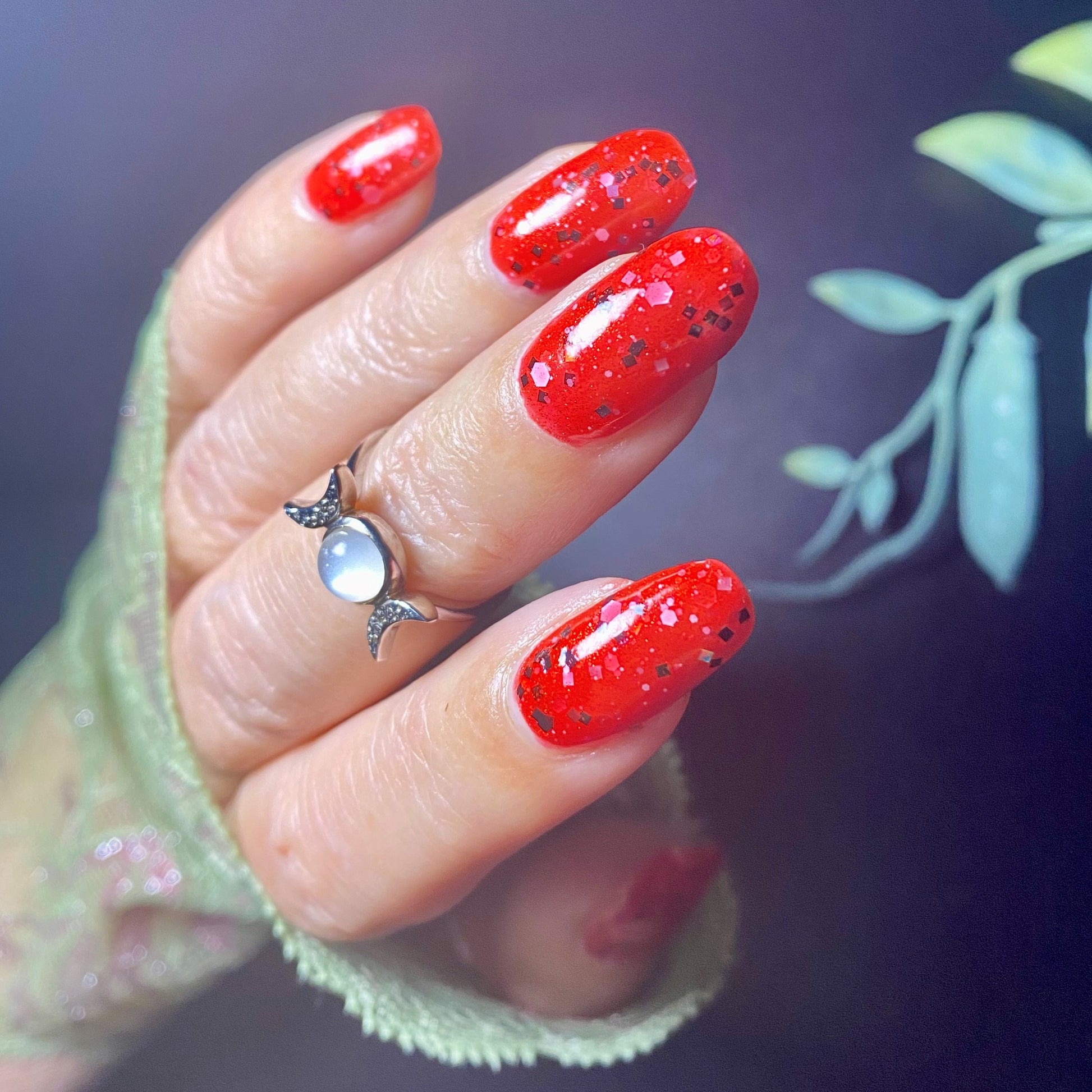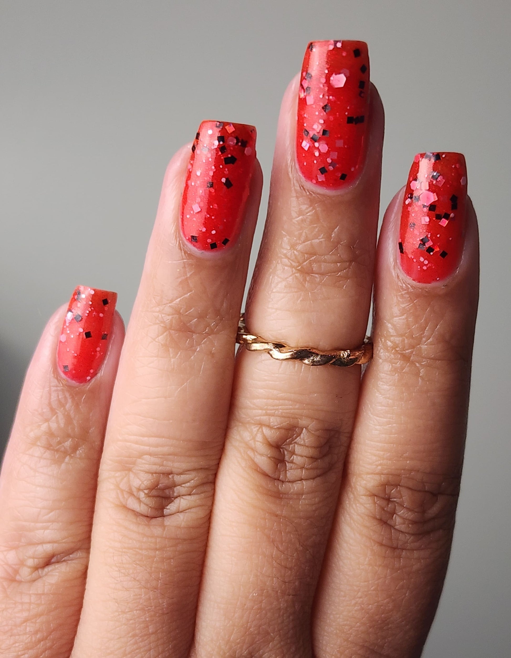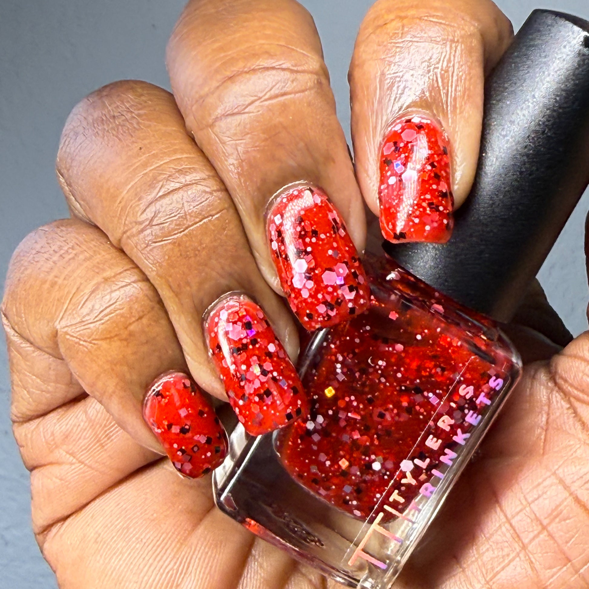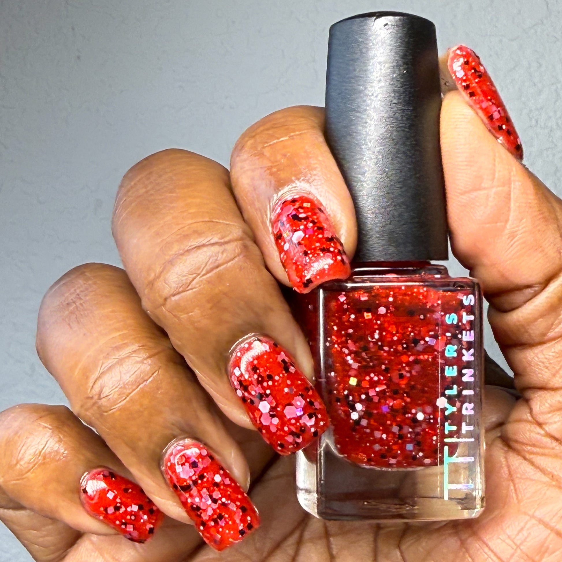 Inspired by the View Master! A red jelly base with red/orange/copper shifting shimmer, white hex glitters, black square glitters, and silver holo square glitters.