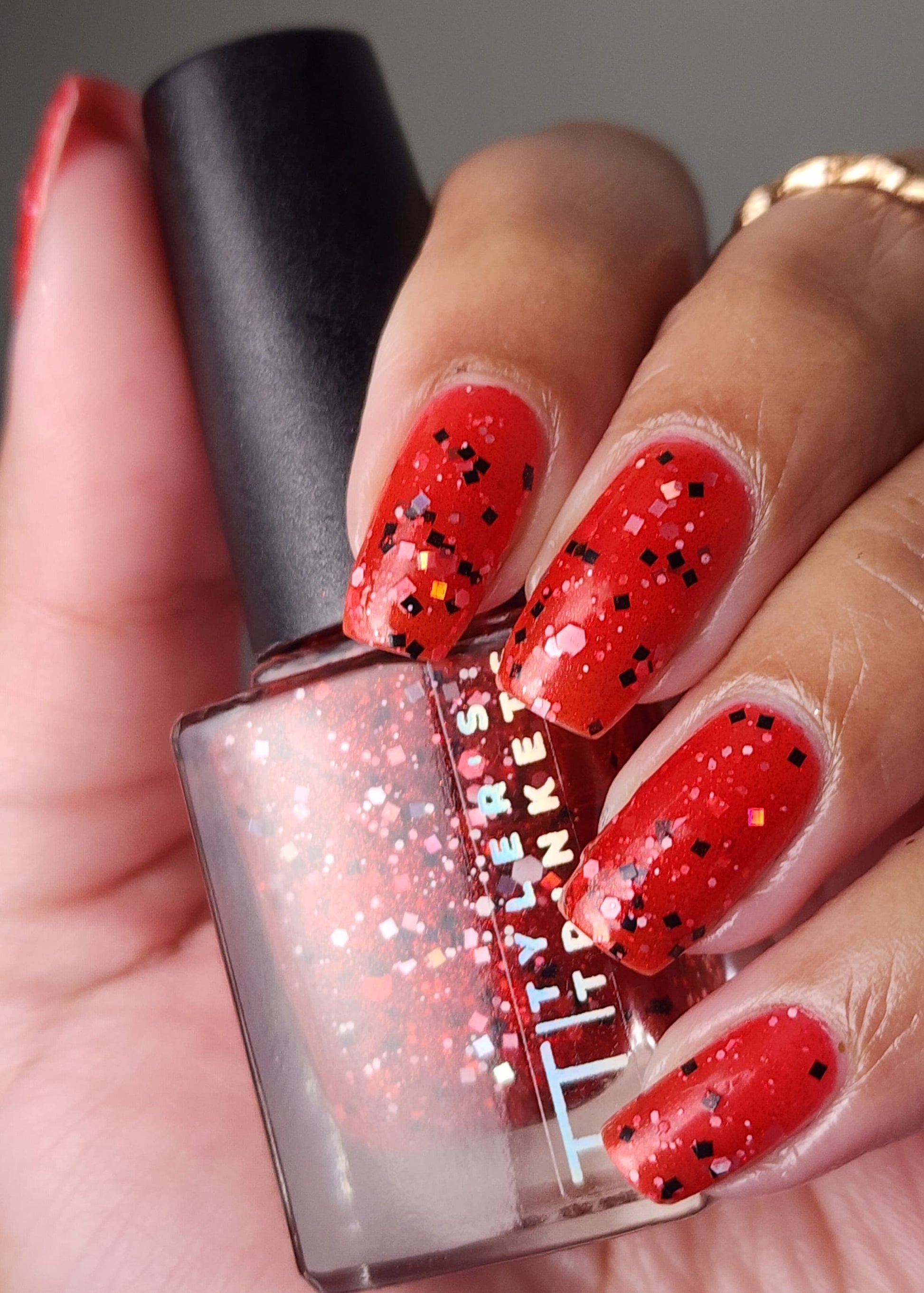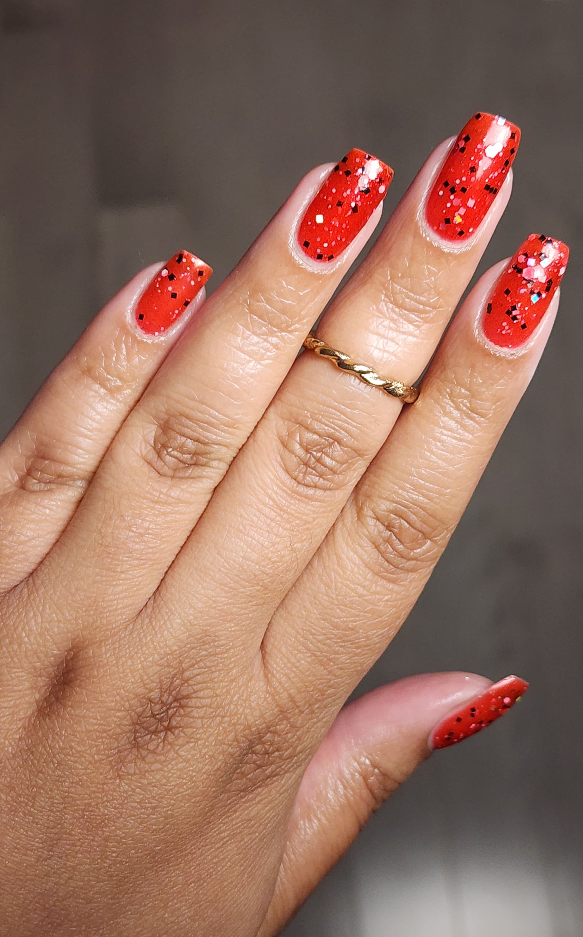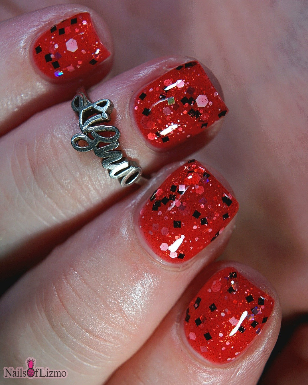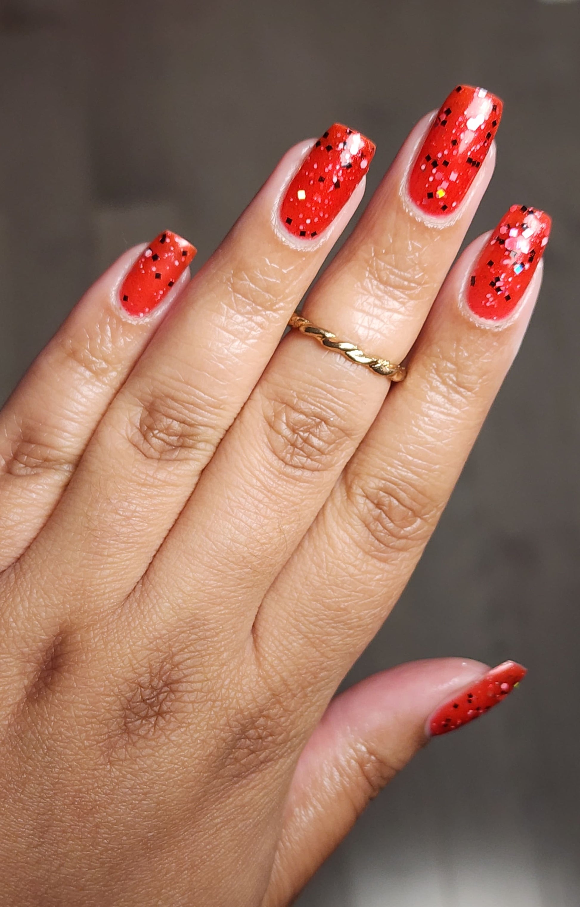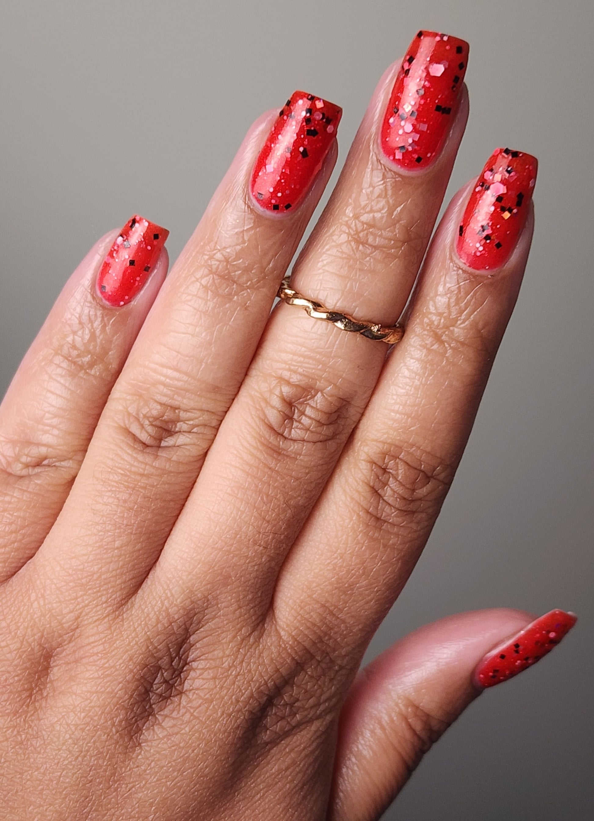 Inspired by the View Master! A red jelly base with red/orange/copper shifting shimmer, white hex glitters, black square glitters, and silver holo square glitters.