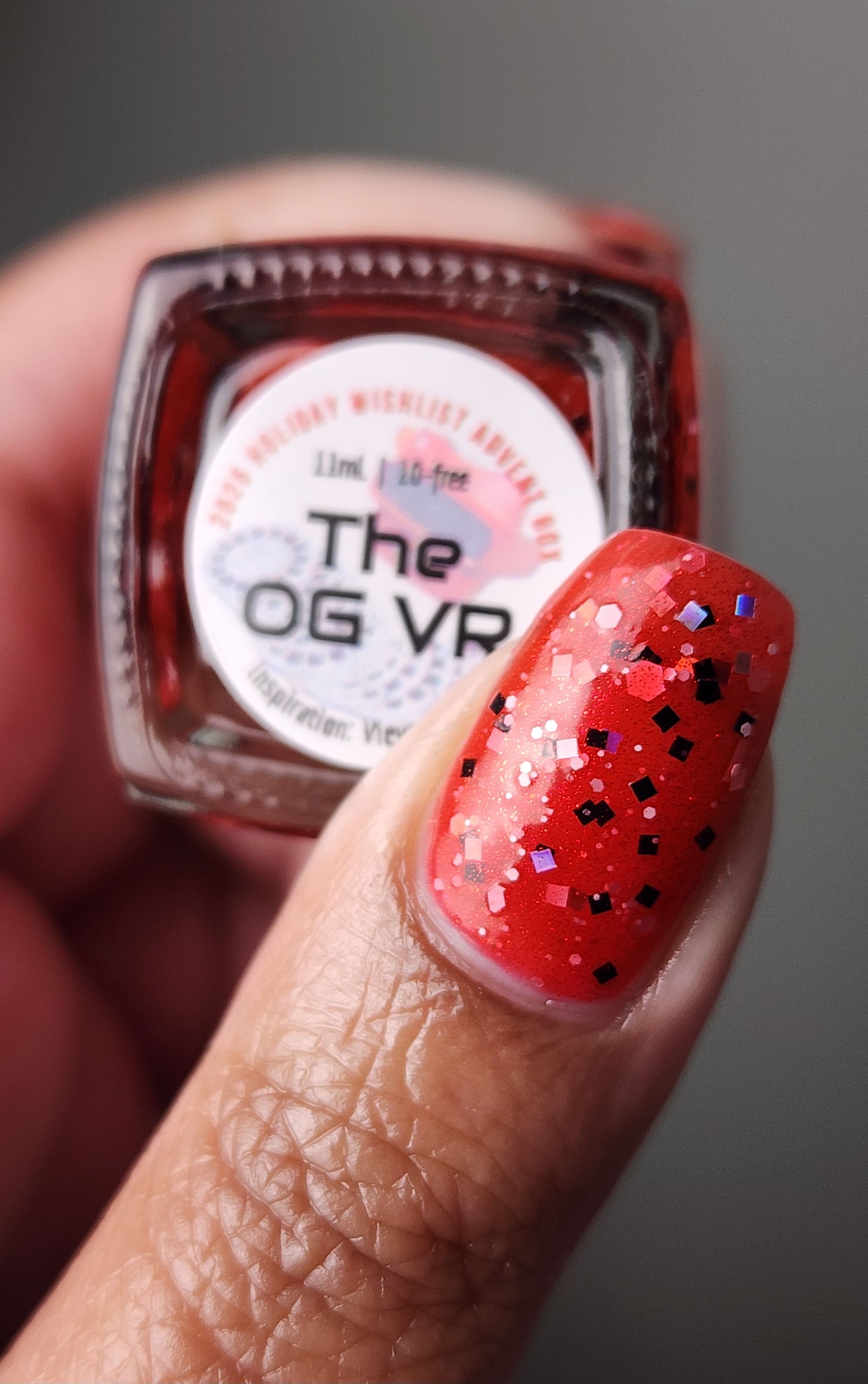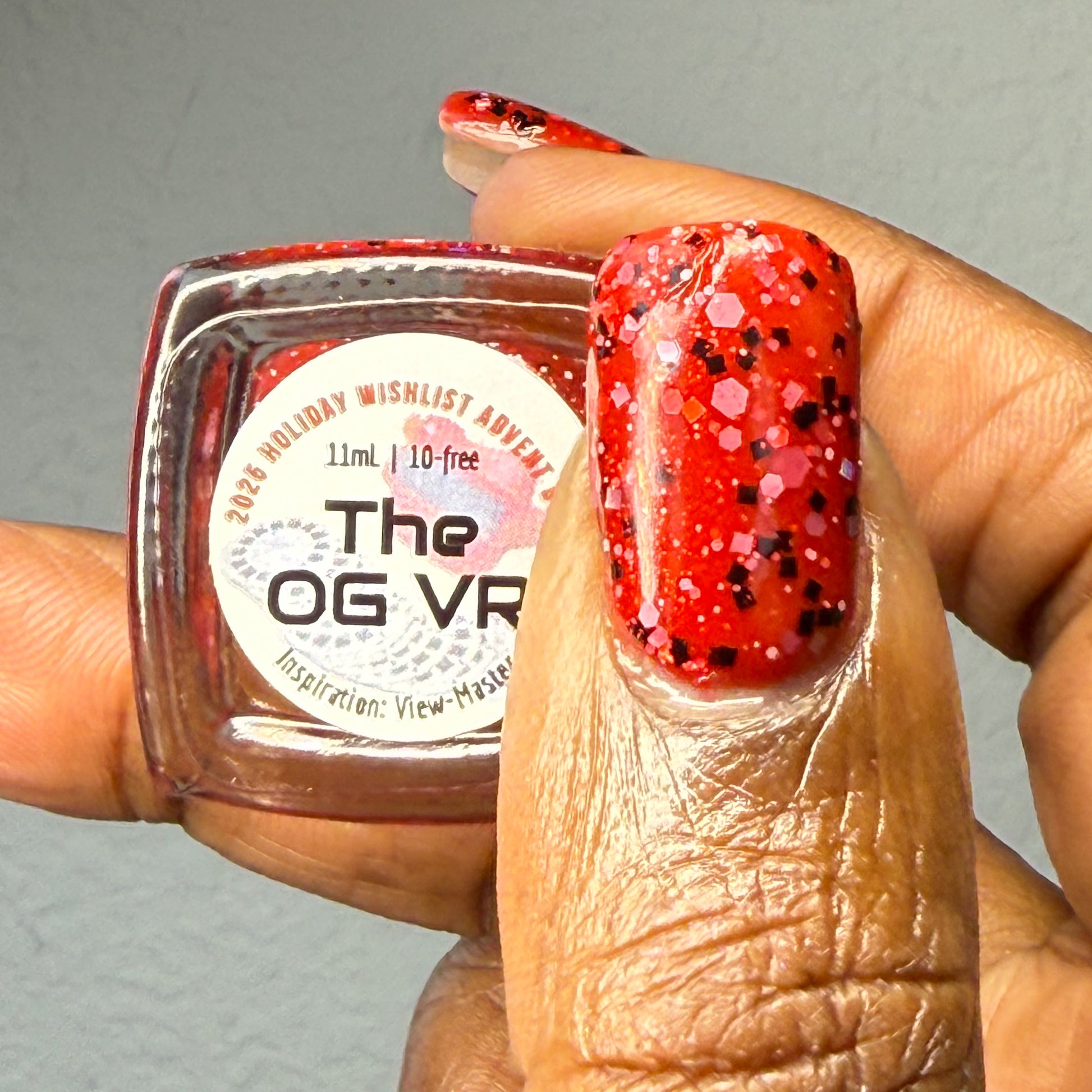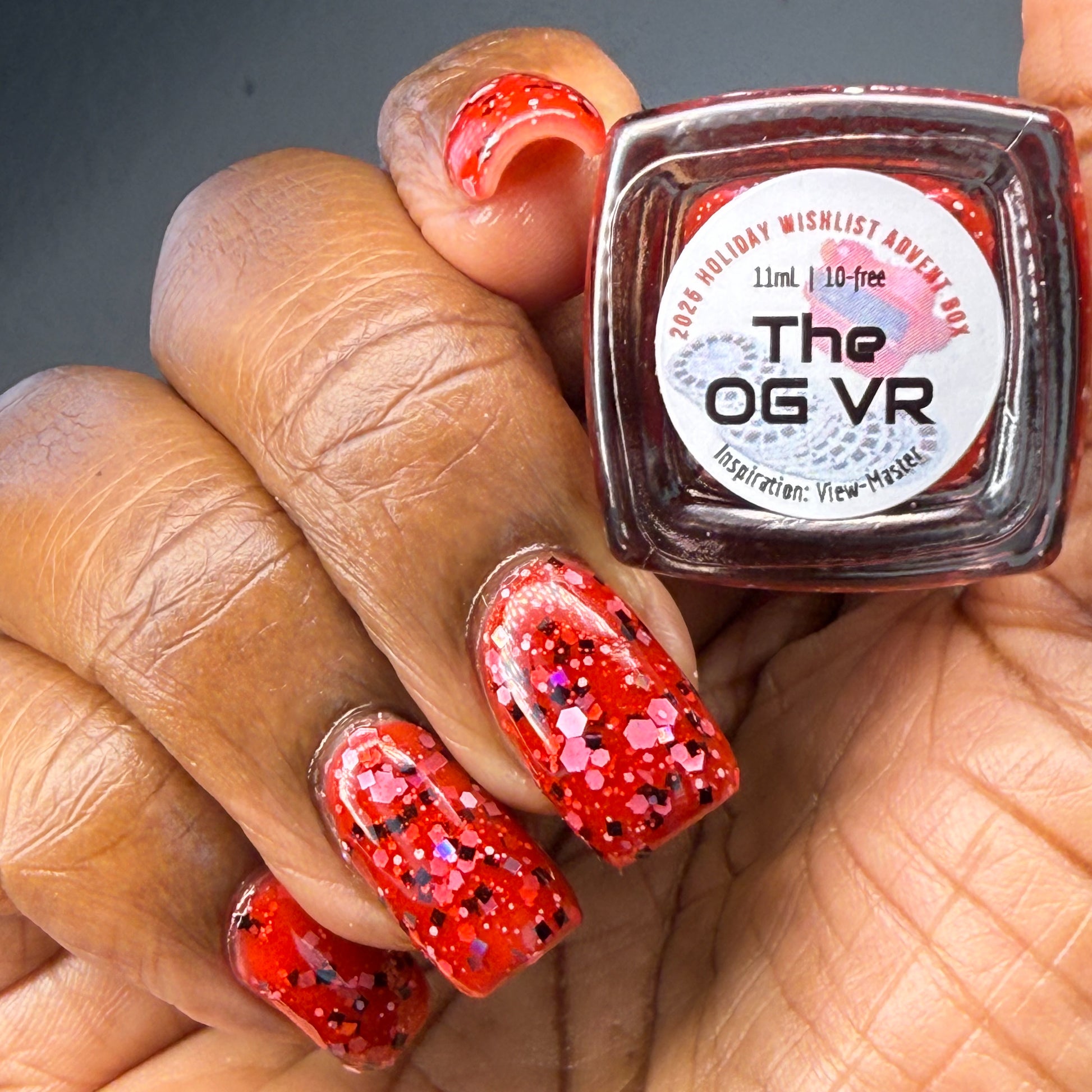 The OG VR - Inspired by the View Master! A red jelly base with red/orange/copper shifting shimmer, white hex glitters, black square glitters, and silver holo square glitters.