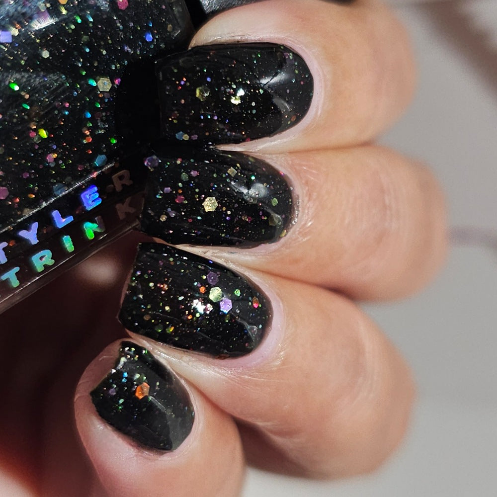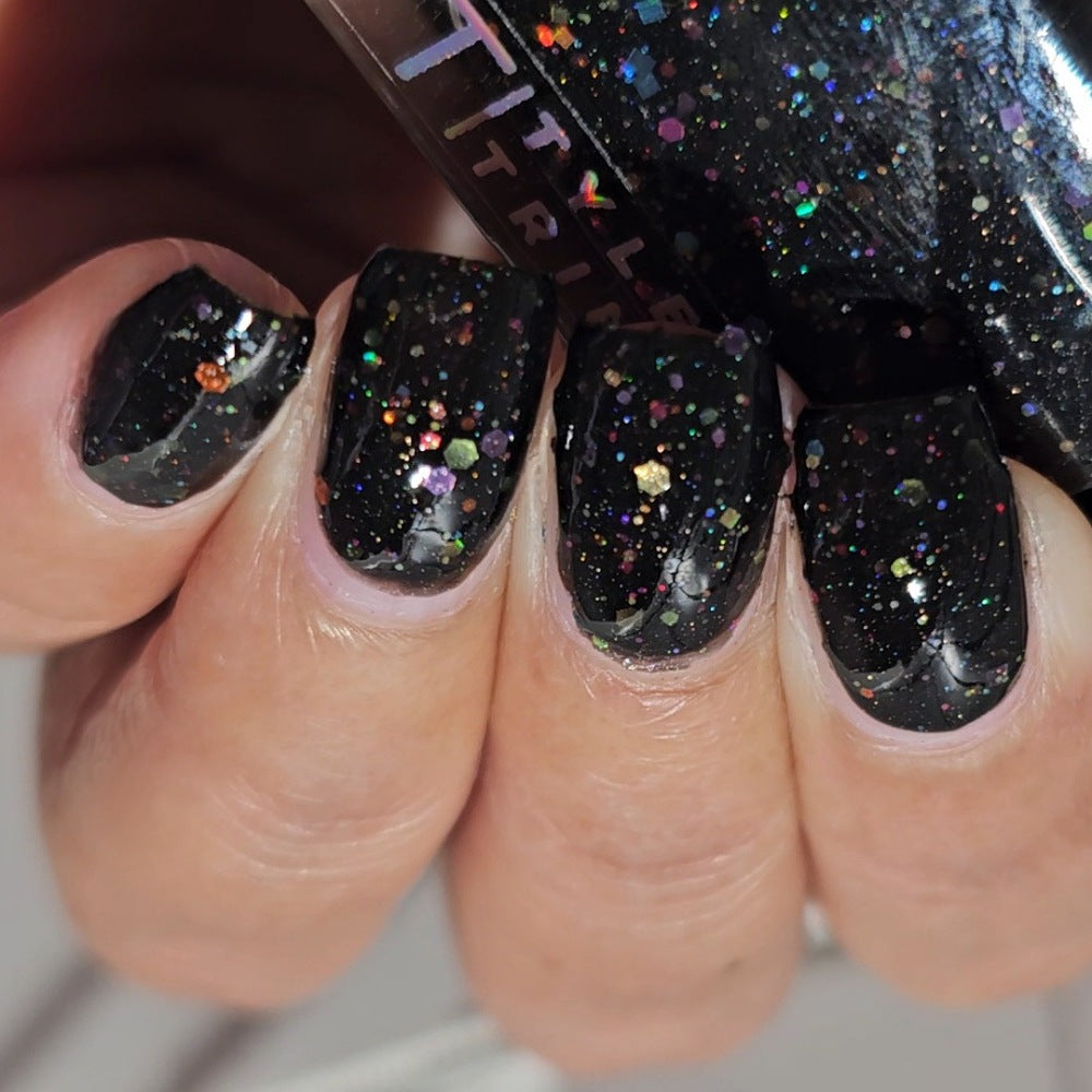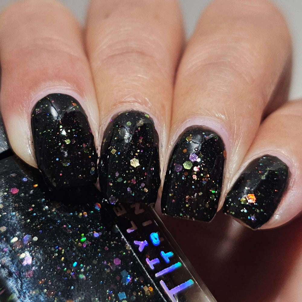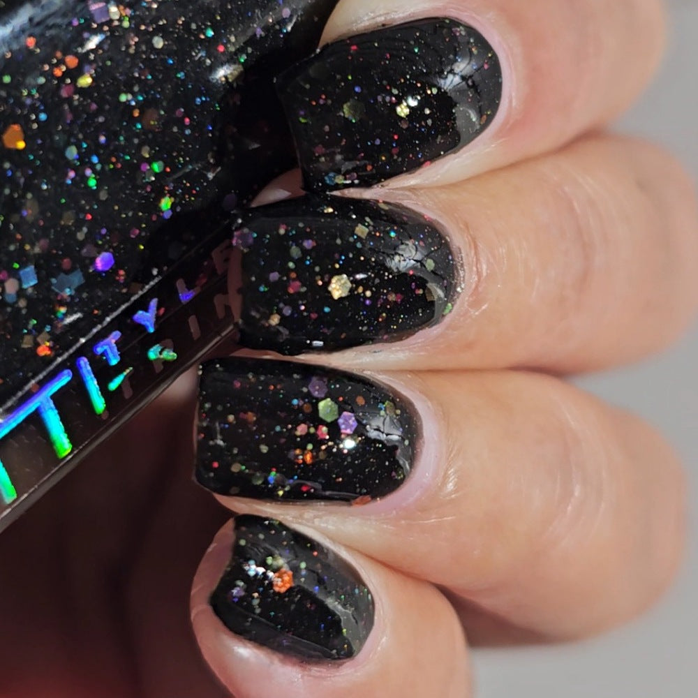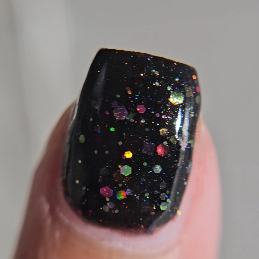 Inspired by Lite Brite! A black jelly base with a touch of linear holo, multicolor holographic hex glitters, and blue glow in the dark pigment.