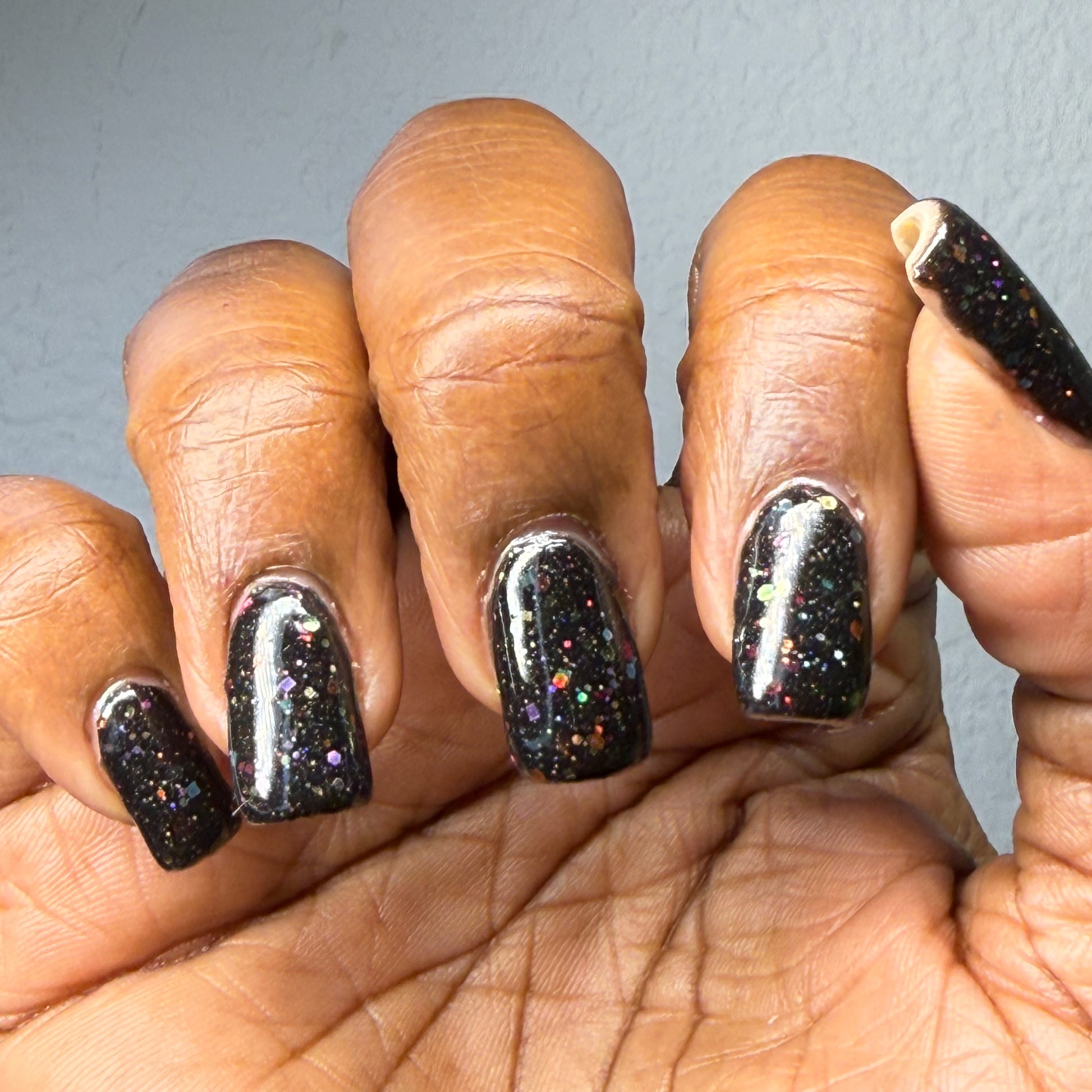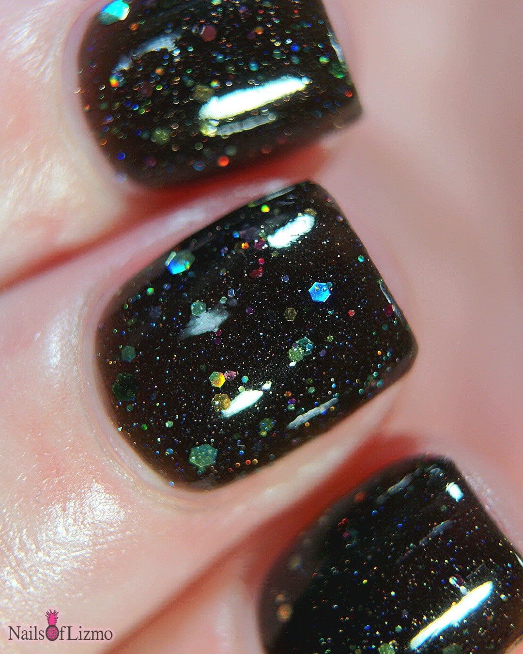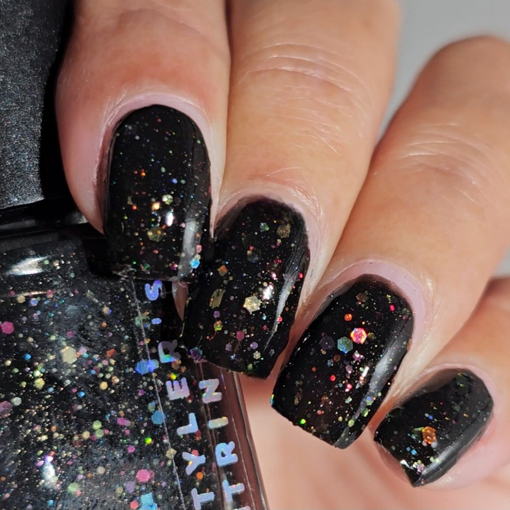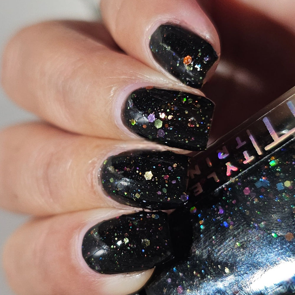Inspired by Lite Brite! A black jelly base with a touch of linear holo, multicolor holographic hex glitters, and blue glow in the dark pigment.