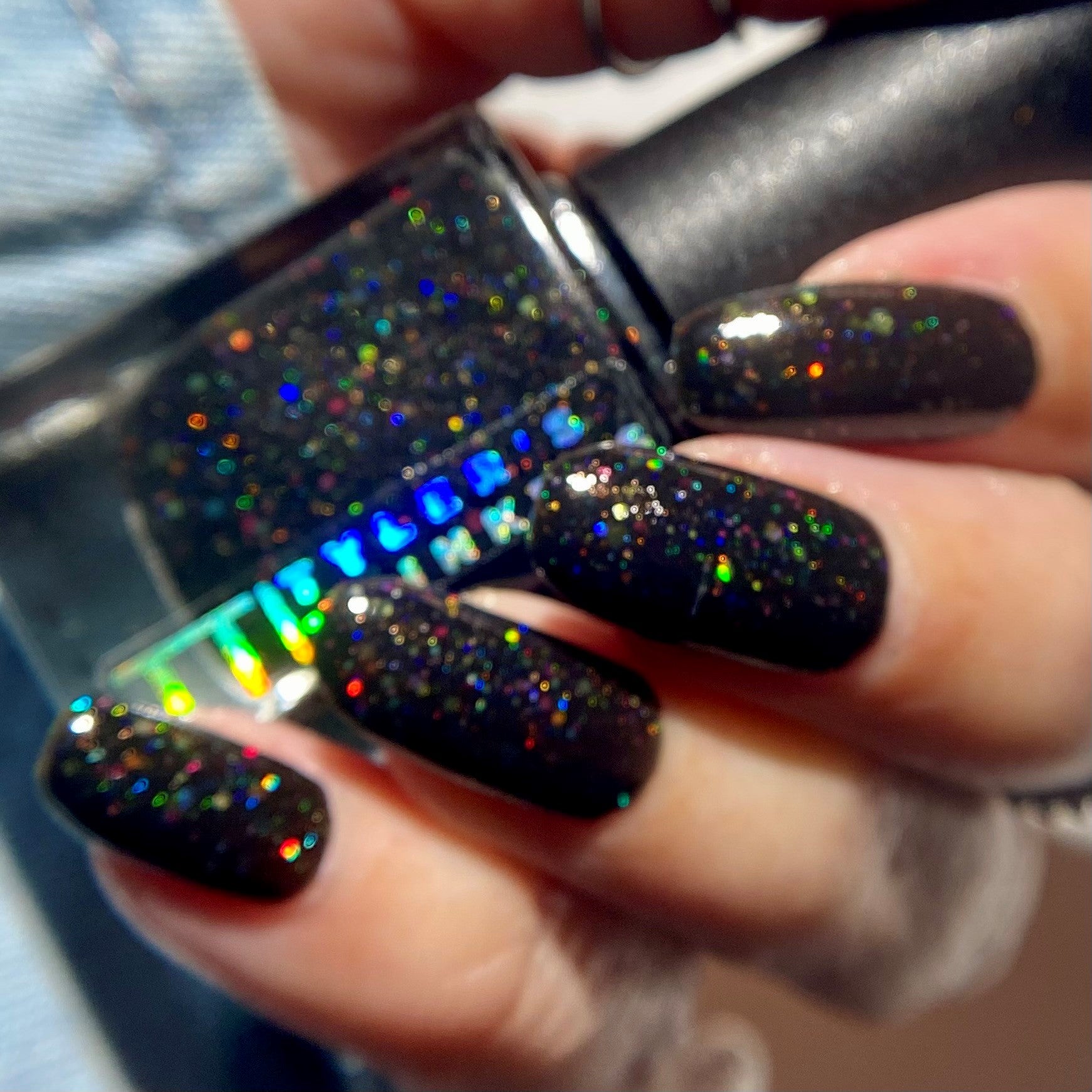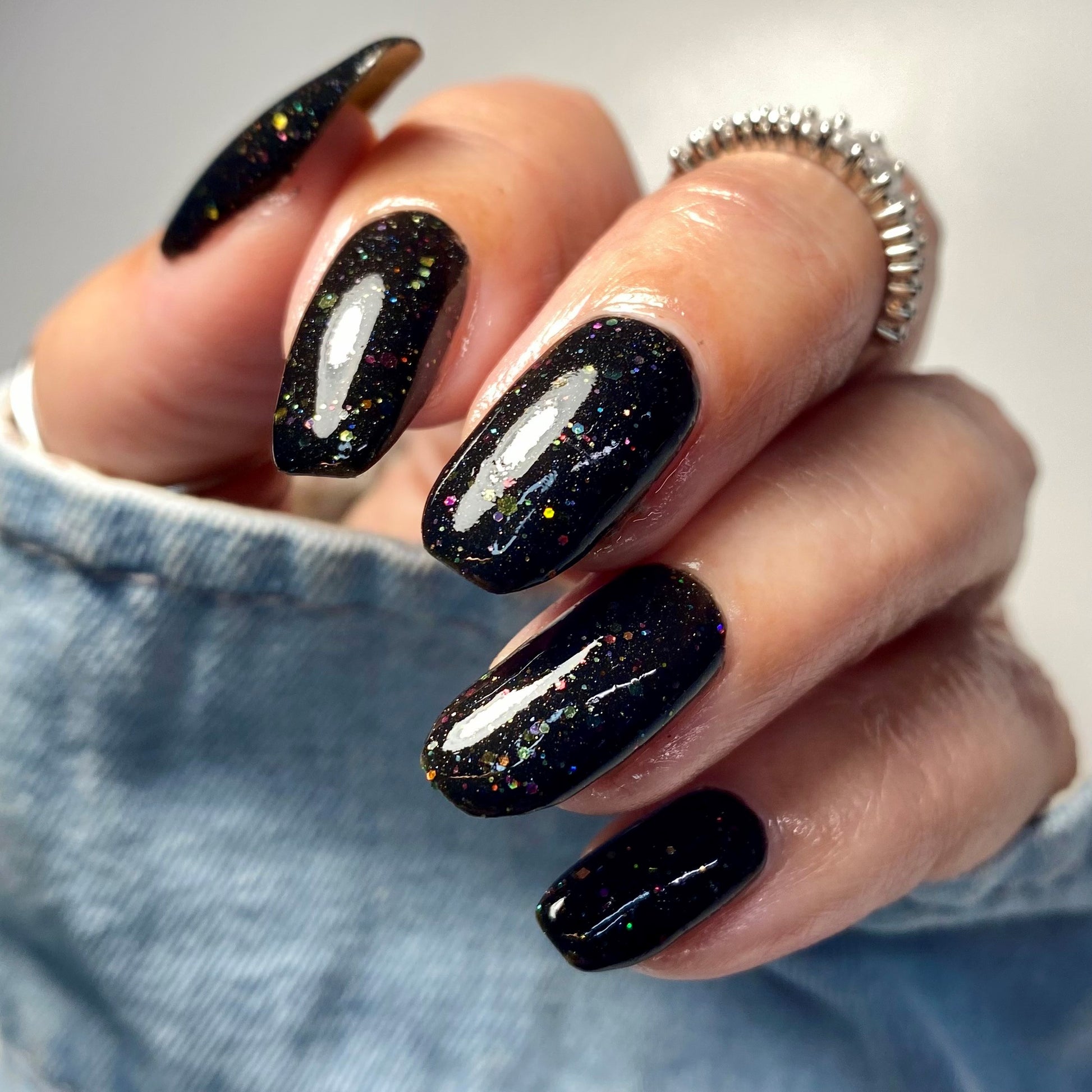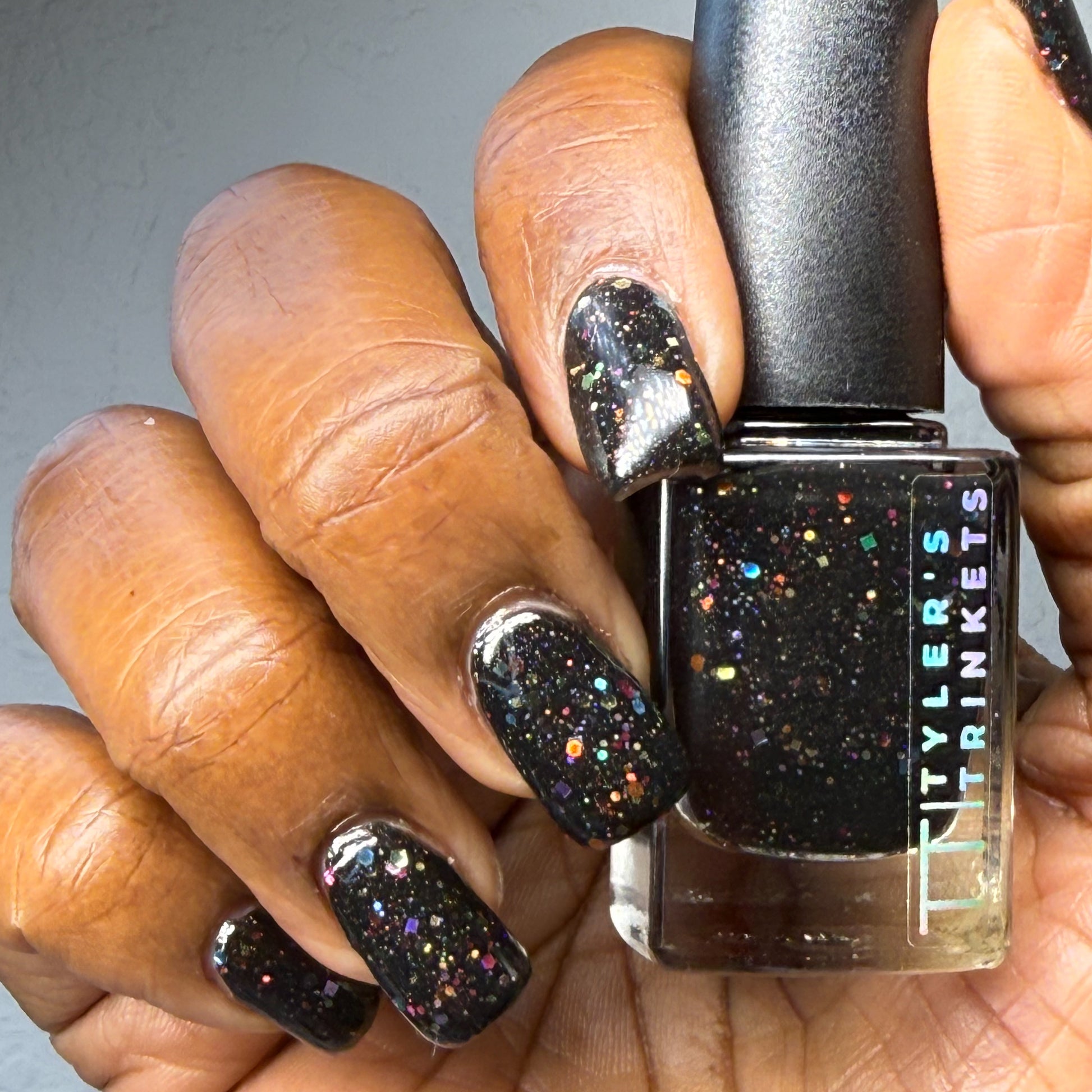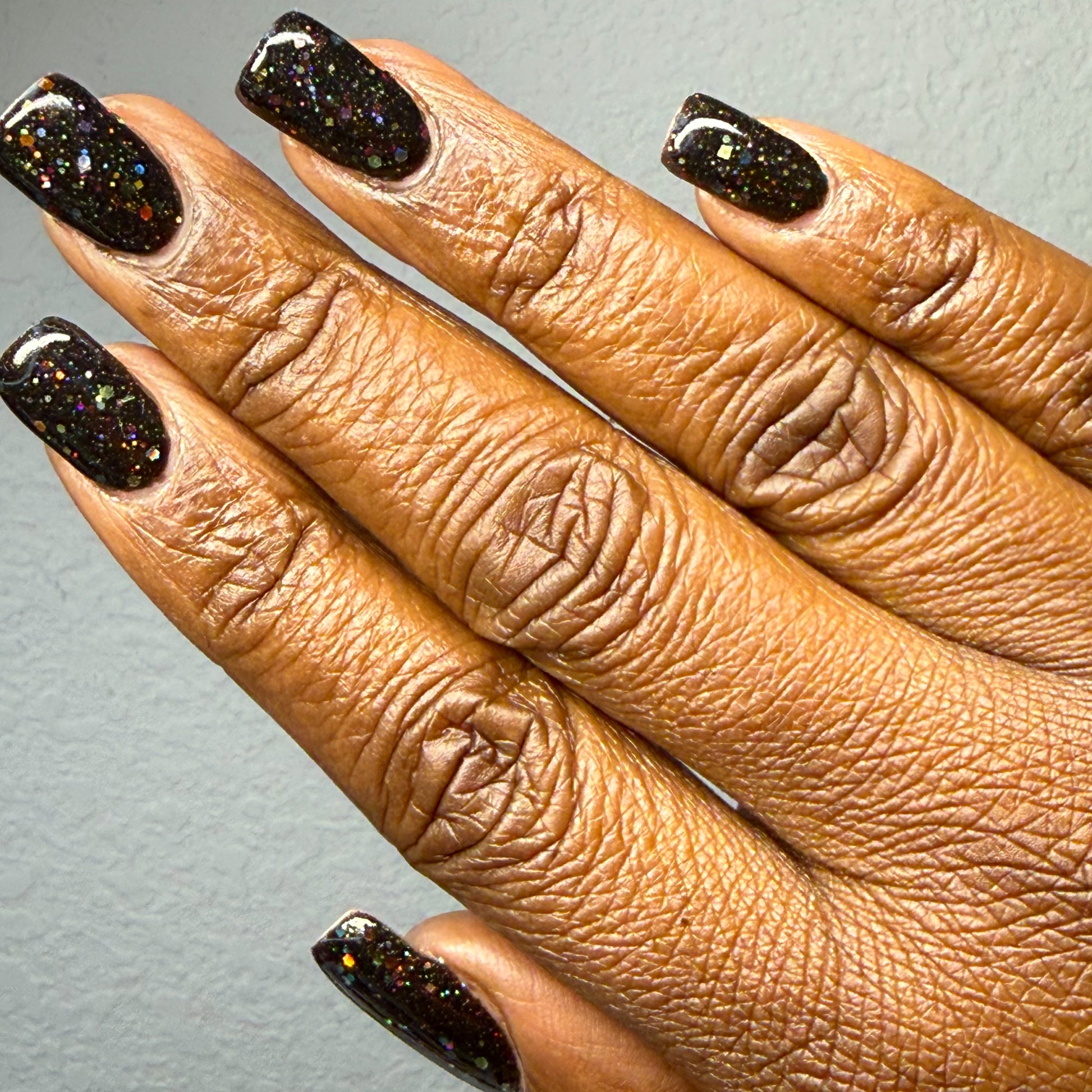 Inspired by Lite Brite! A black jelly base with a touch of linear holo, multicolor holographic hex glitters, and blue glow in the dark pigment.