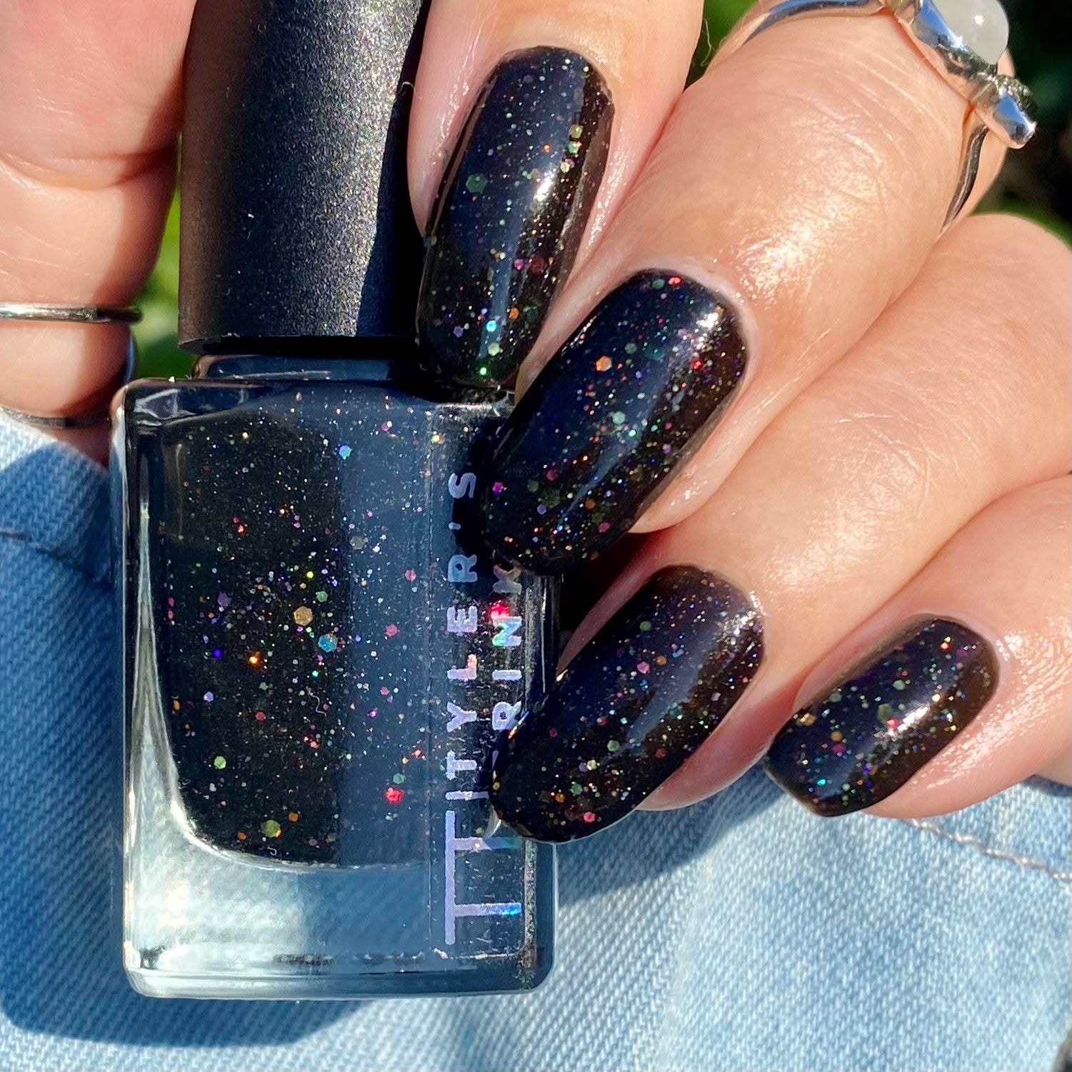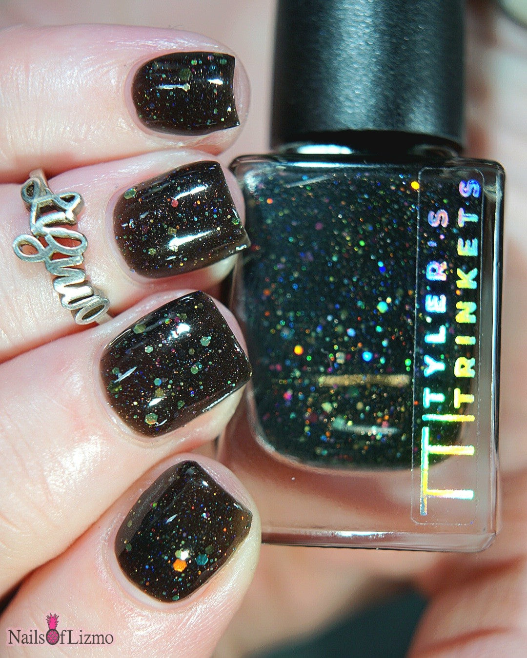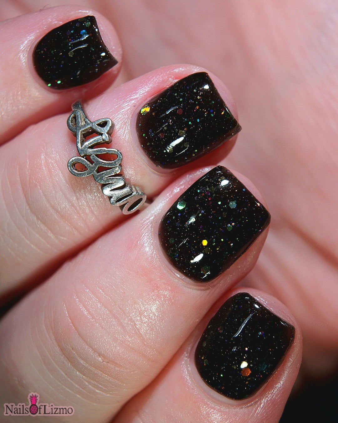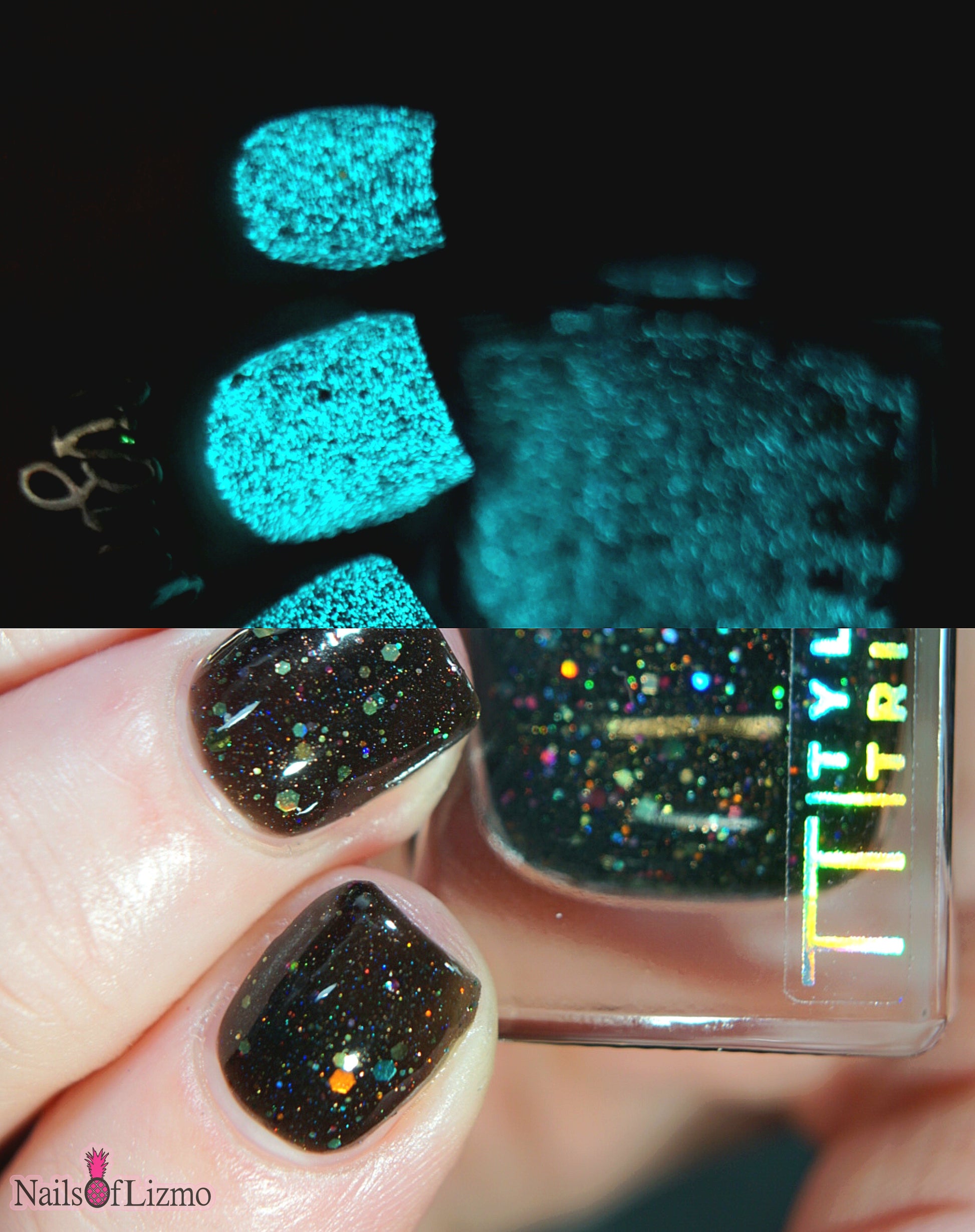 Inspired by Lite Brite! A black jelly base with a touch of linear holo, multicolor holographic hex glitters, and blue glow in the dark pigment.