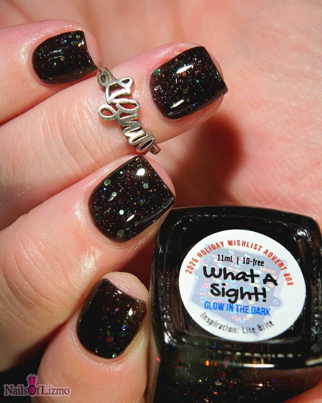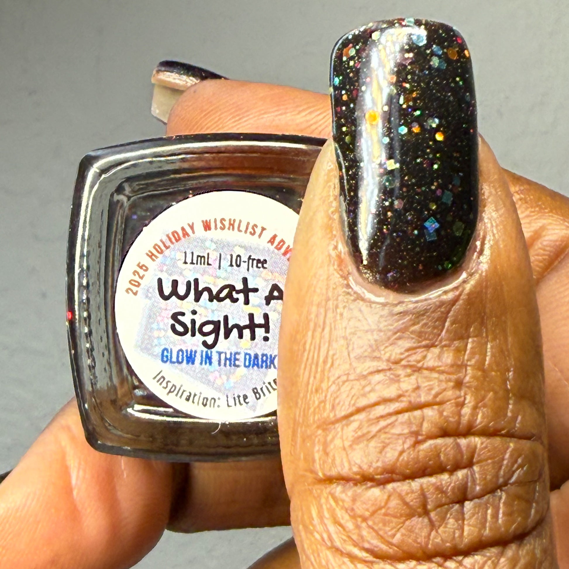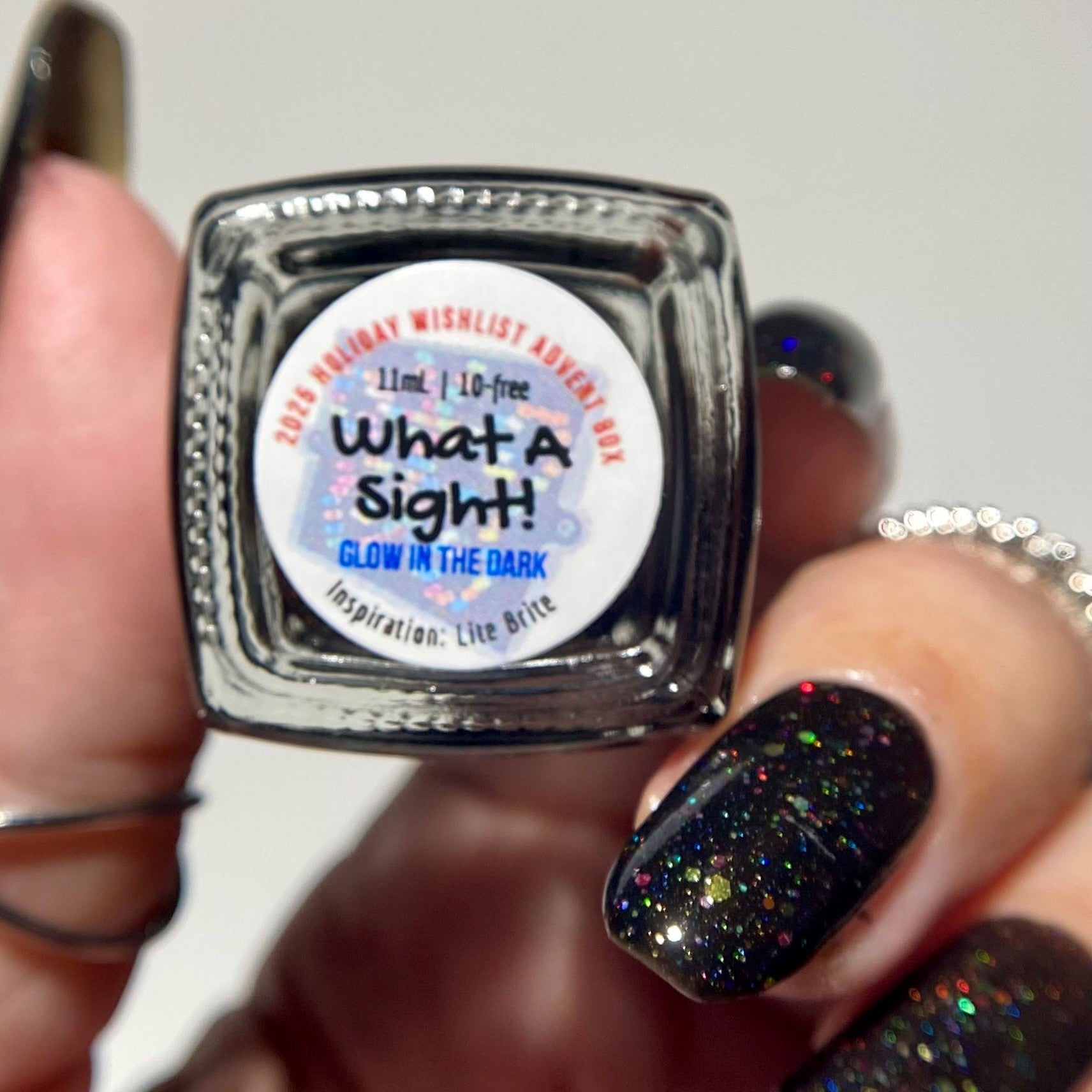 What A Sight - Inspired by Lite Brite! A black jelly base with a touch of linear holo, mutlicolor holographic hex glitters, and blue glow in the dark pigment.