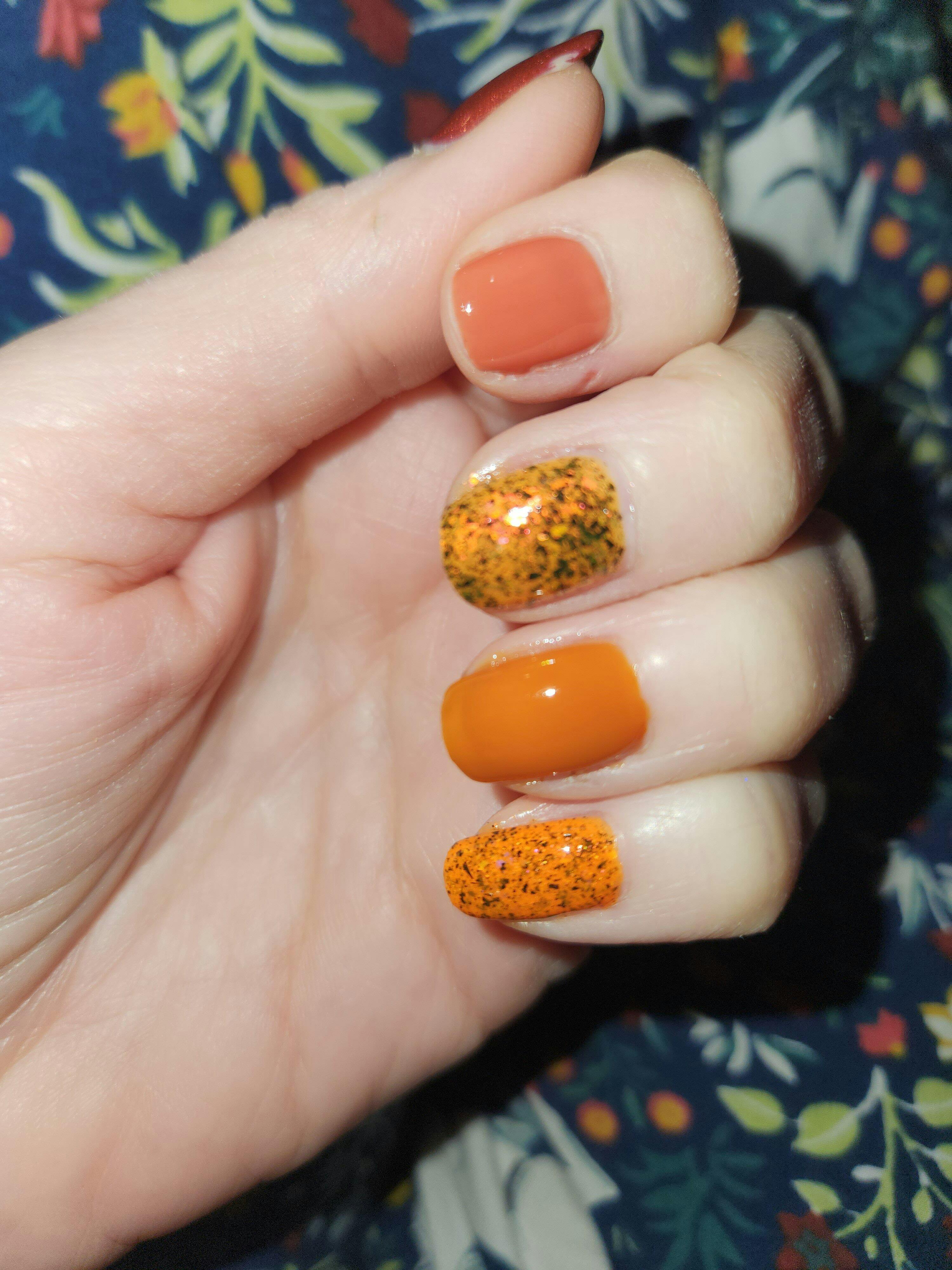 First, I love oranges year round, BUT this is such an Autumn orange, that does well for Halloween, too. On the pinky nail!