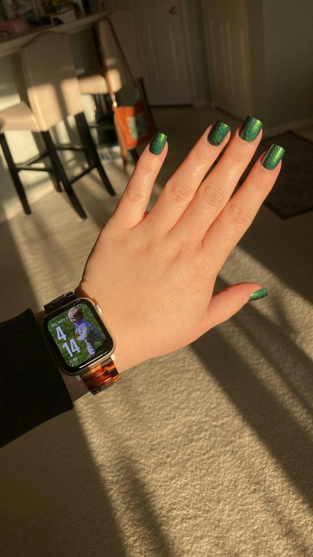 In the words of Glinda, I’m obsessulated. This color is so gorgeous, I had a hard time choosing what to do next because I loved it that much! The photo doesn’t do it justice; this stuff SPARKLES in the sun! I got so many compliments, they were perfect as my pre Wicked For Good nails💚🩷