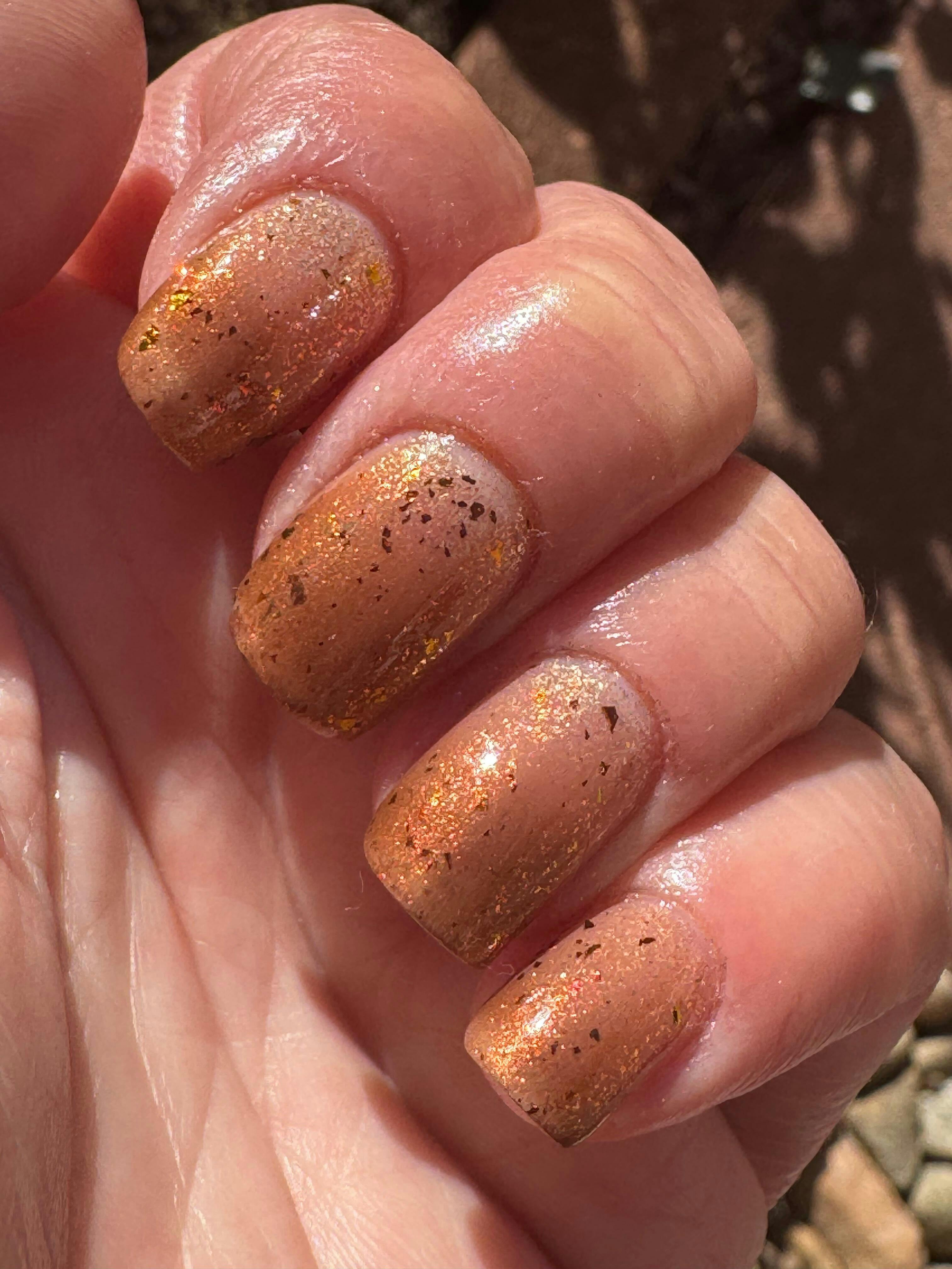 The red, gold, and green (at some angles) flakes are perfect. They vary in size so it is a wonderful surprise to see how they land on each nail. The shimmers add the final touch to the most beautiful autumn flakey topper in my collection (I have thousands so that is saying a lot)!