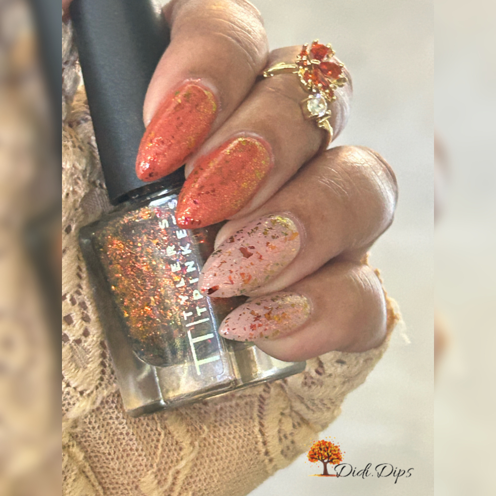 Introducing 'Fallen Leaves', the enchanting nail polish topper that captures the essence of autumn in a bottle! With its clear base adorned with mesmerizing red and gold shimmers, and a delightful dance of red-gold-copper shifting chameleon flakes, your nails will be adorned with the vibrant hues of autumn leaves. 🍁✨