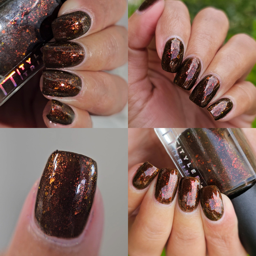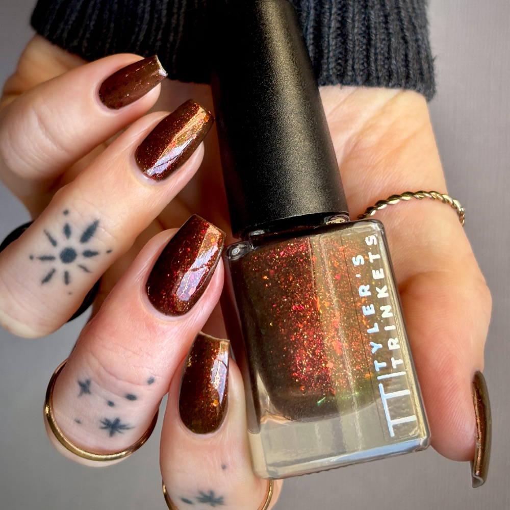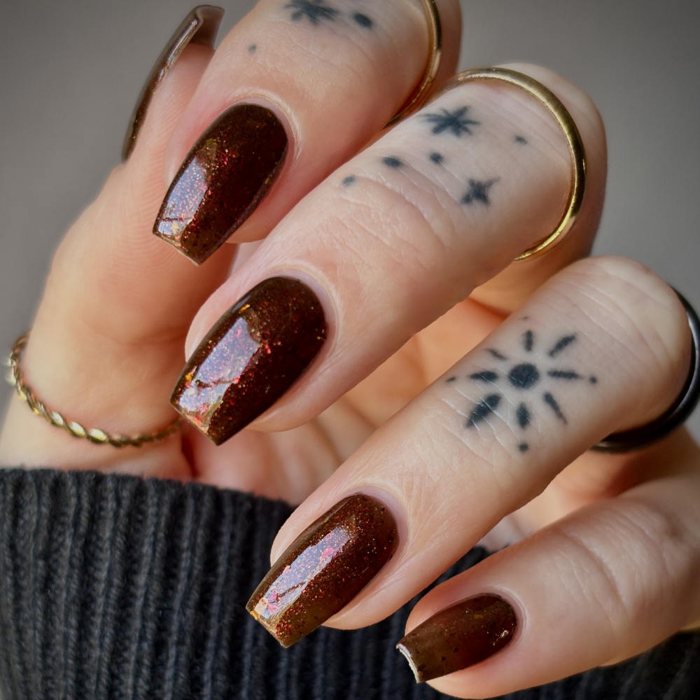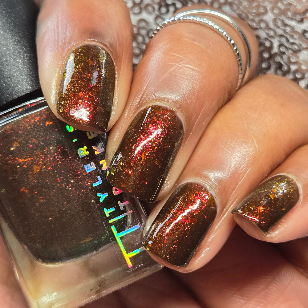 A limited edition, single-batch polish is a dark brown crelly base with red/orange shimmer and red/orange/gold/green metallic flakes.