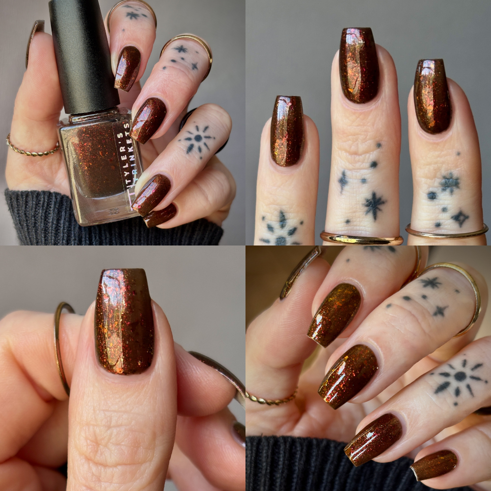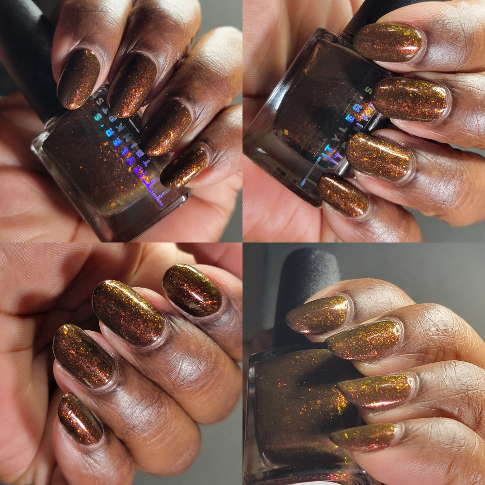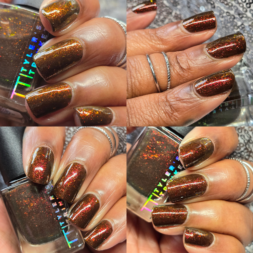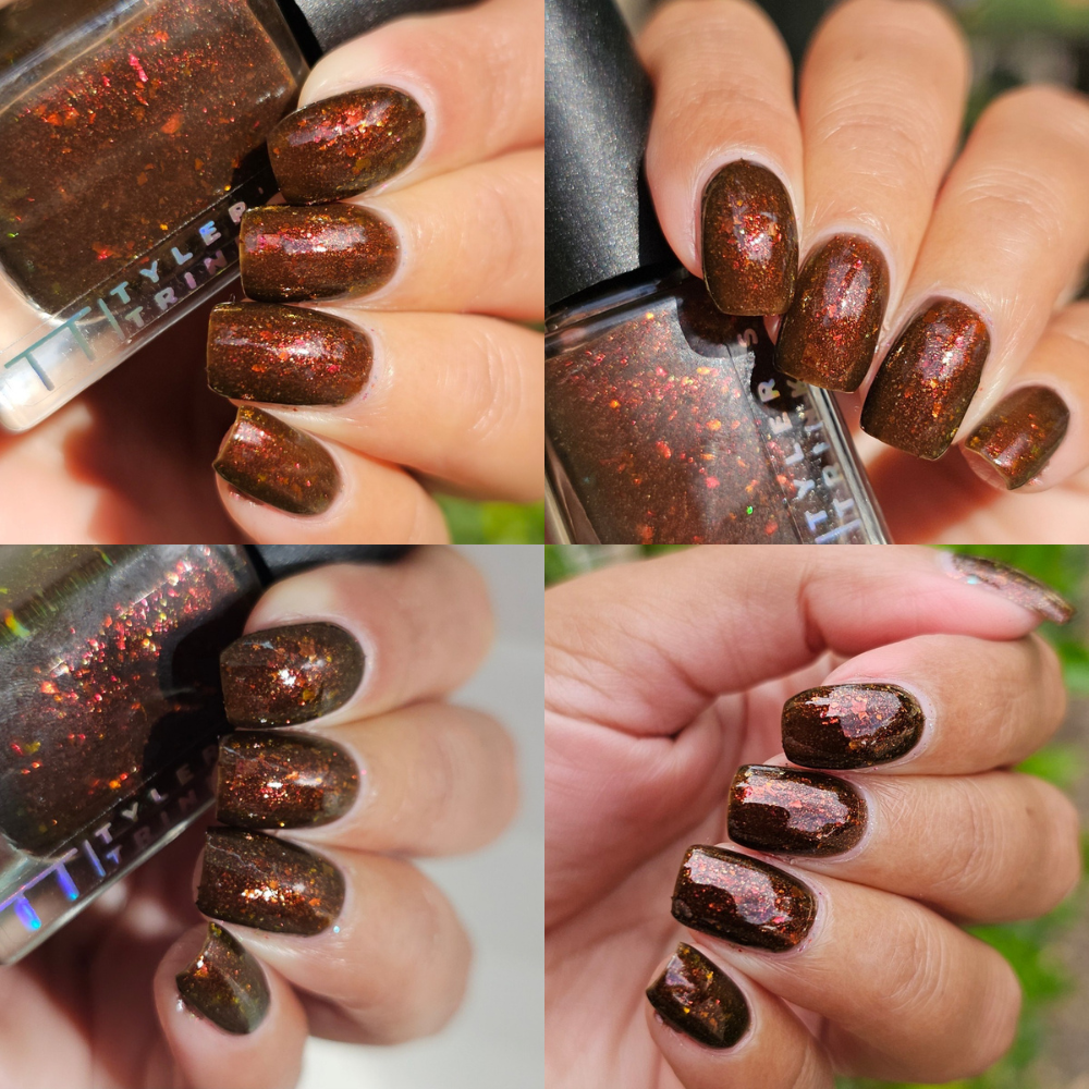 A limited edition, single-batch polish is a dark brown crelly base with red/orange shimmer and red/orange/gold/green metallic flakes.