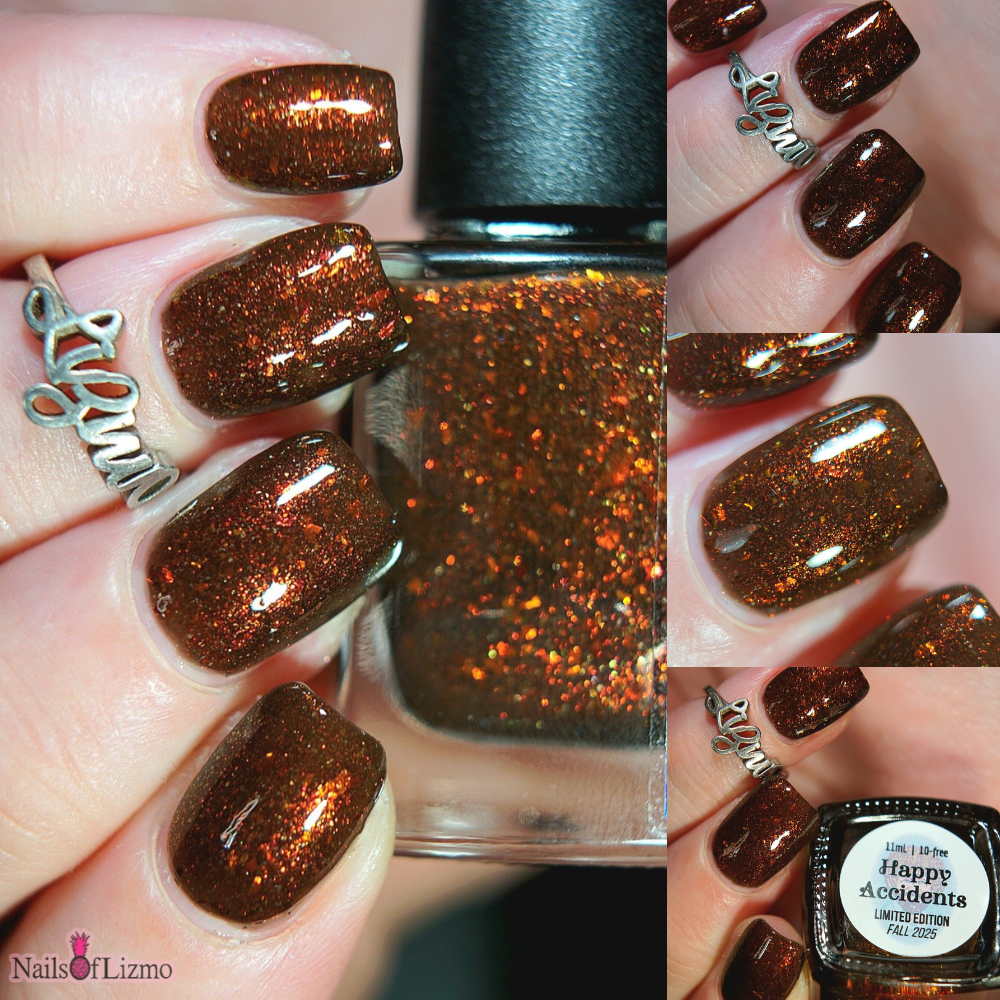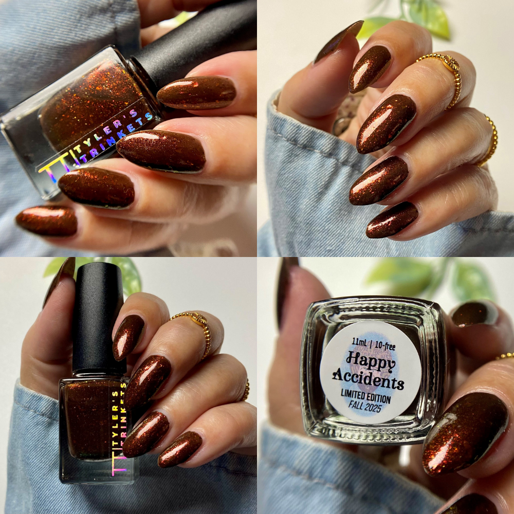 While mixing up the restock of Fallen Leaves 2.0, I accidentally added the wrong pigment which made the topper far too shimmery. So I decided to add in some brown pigment and created a happy little accident ??. This limited edition, single-batch polish is a dark brown crelly base with red/orange shimmer and red/orange/gold/green metallic flakes.