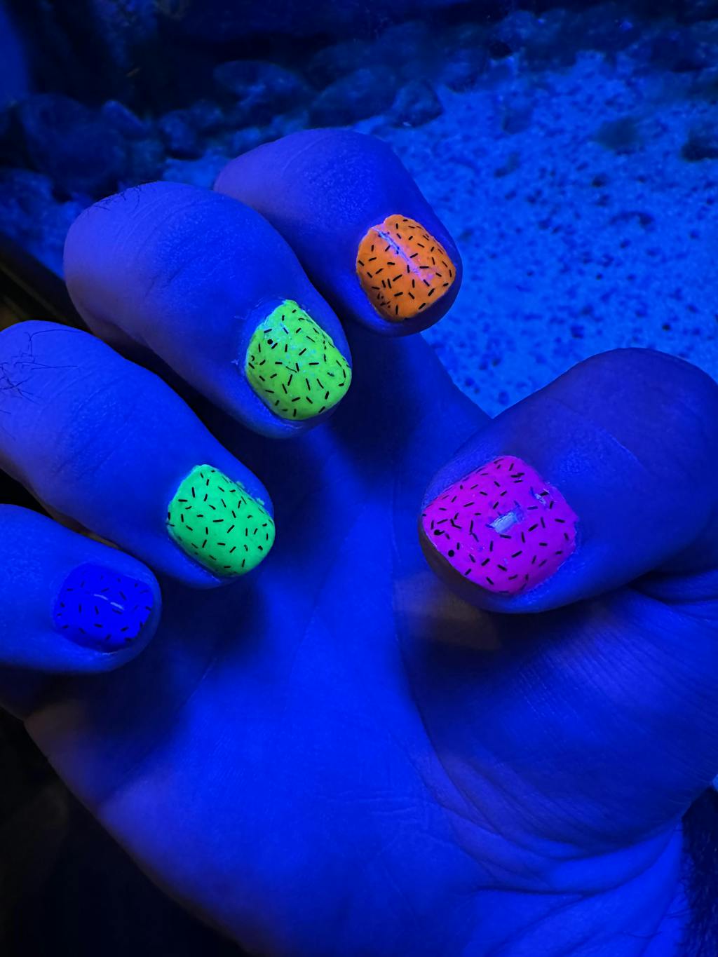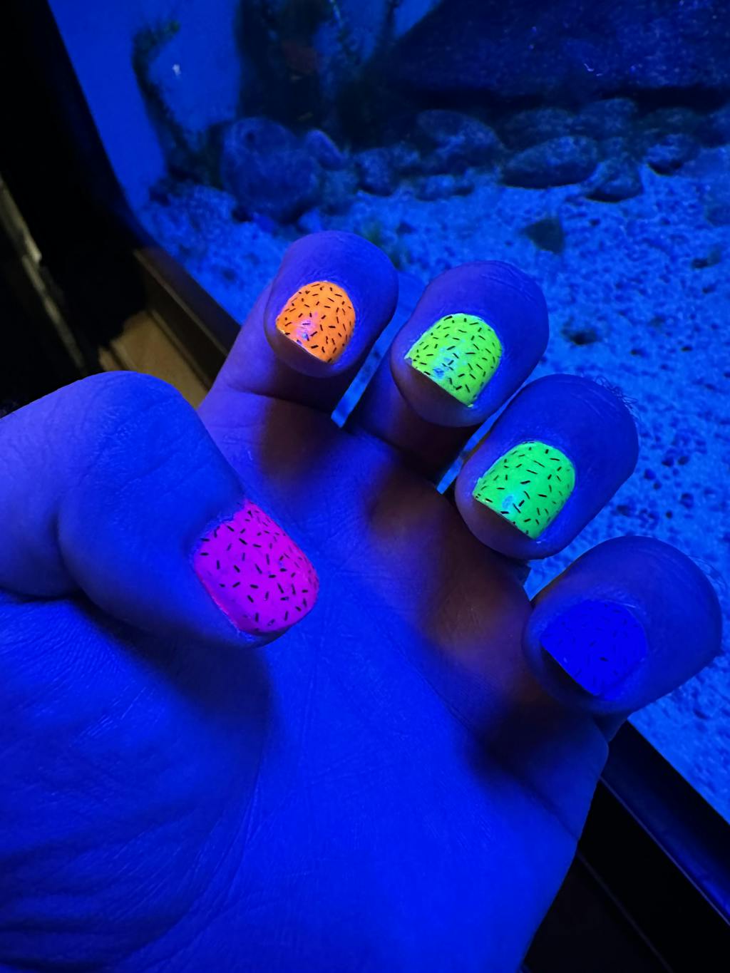 Note: These are black-light reactive neon polishes. They are not glow-in-the-dark.