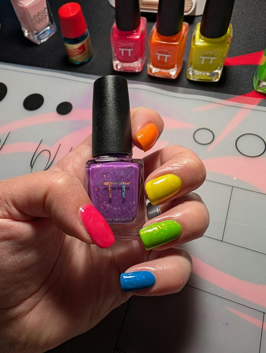 Each shade consists of a black light reactive neon base color, a touch of shimmer, and a ton of color-shifting iridescent flakes to add dimension.