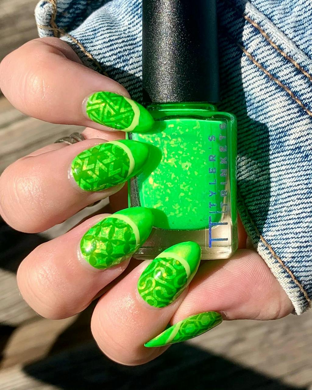 my favourite of the collection, beautiful neon green with yellow leaning flakes, crelly formula is nice and was opaque in two coats over a blurring base coat