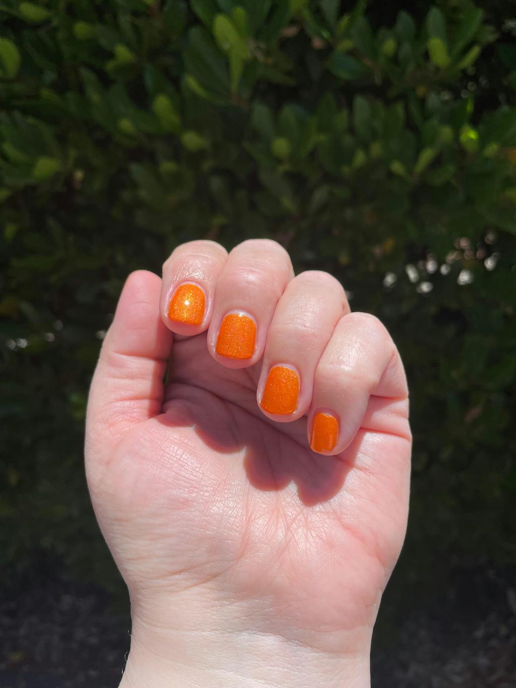 Absolutely perfect orange. It is delicious and sparkly. It does not, however, have a strong Holo effect. I was sort of expecting that from the product photos. Actually, the polish is the most true-to-produxt-photos that I have aeen yet. A+